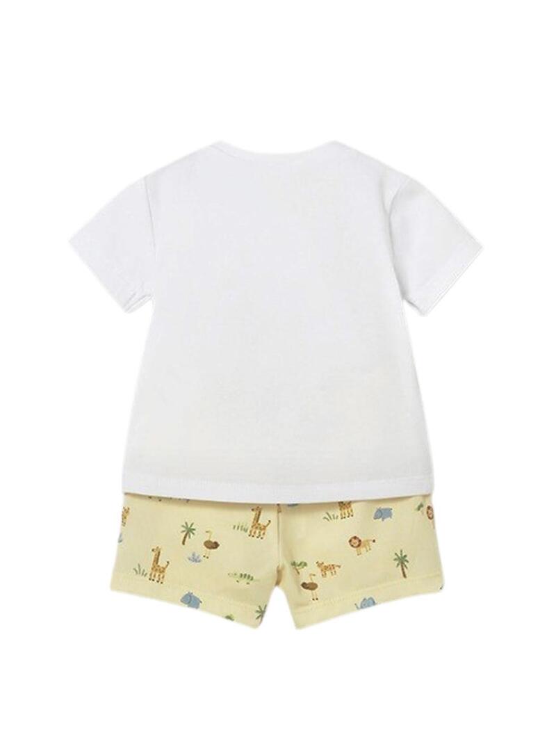 Conjunto Mayoral com dois looks em tons branco, amarelo e bege, perfeito para o verão do bebê. Inclui duas camisetas de manga curta com detalhes divertidos de safari, uma com animais bordados e outra com bolso decorativo, combinadas com duas bermudas combinando.