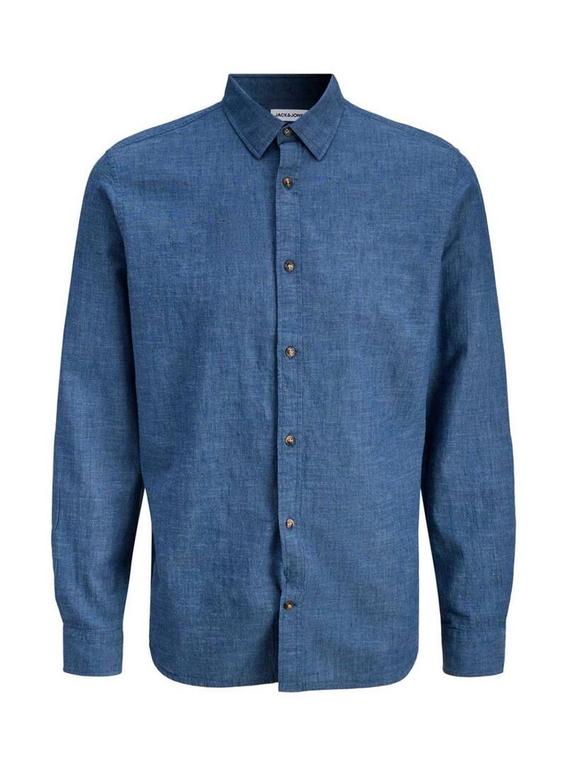 Camisa Jack and Jones. Modelo Summer. Cor azul. Gola camiseira regular. Fecho com botões. Tecido de algodão com linho. Estilo básico. Ajuste regular.