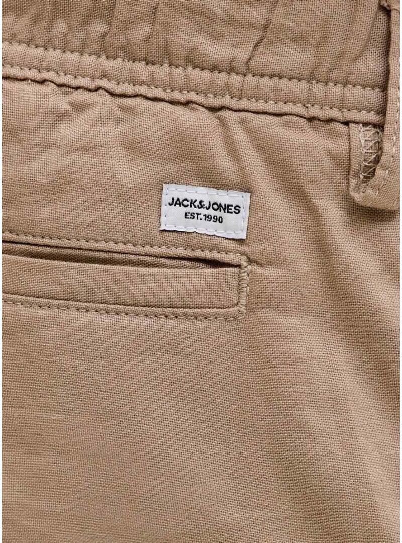 Bermudas Jack and Jones. Modelo Jaiden. Cor camel. Cintura elástica com cordão ajustável. Fecho de botão e zíper. Bolsos laterais. Bolsos traseiros em viva. Corte reto. Passadores para cinto. Parche da marca na parte traseira. Confeccionado em algodão e linho.
