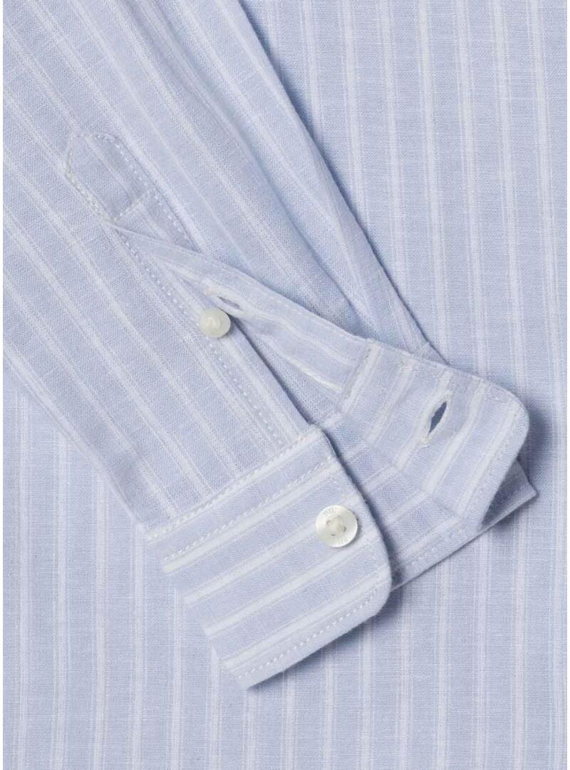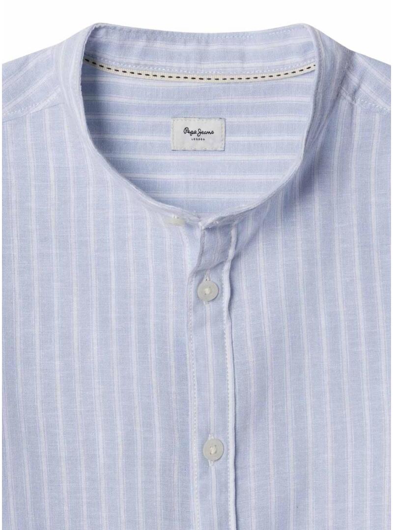 Camisa Pepe Jeans. Cor azul. Tecido de linho. Estampado de riscas. Gola mao. Manga comprida. Fecho frontal com botões. Corte relaxado.