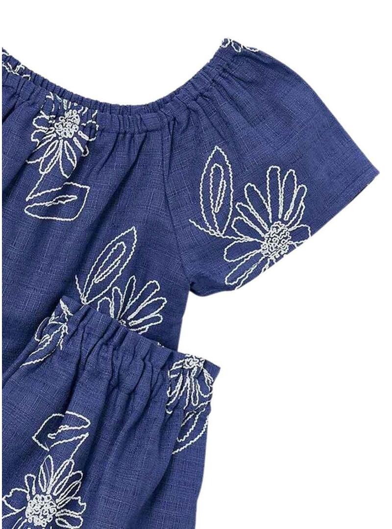 Conjunto Mayoral. Modelo Porcelana. Cor azul marinho. Flores bordadas em linha branca. Top de manga curta com decote amplo. Comprimento cortado. Extremidades elásticas. Saia com cintura elástica. Comprimento mini.