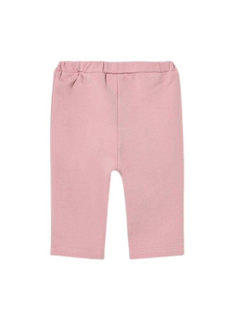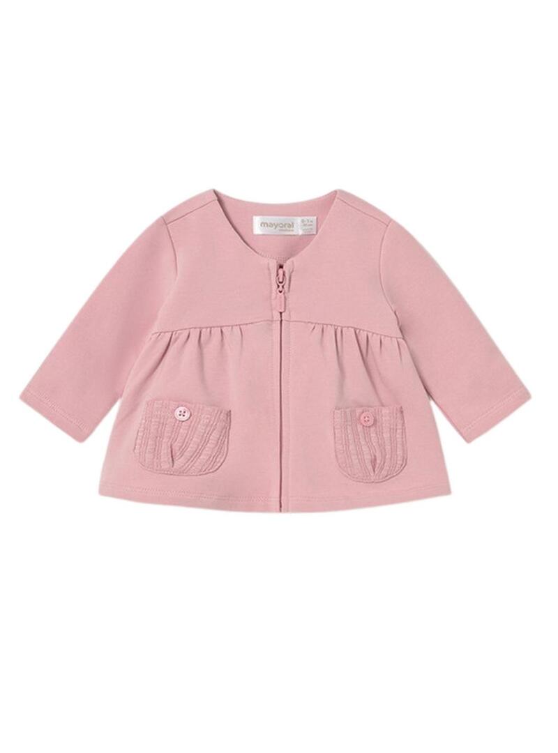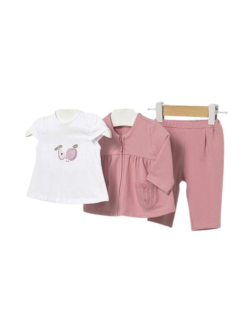 Conjunto de 3 peças Mayoral. Cor rosa pastel. Inclui camiseta branca de manga curta com pequeno bordado frontal. Jaqueta lisa com zíper. Calça com elástico na cintura.