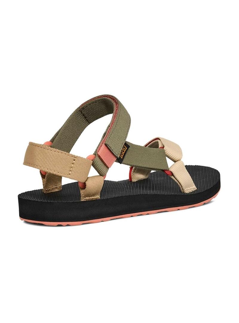 Sandálias Teva. Modelo Universal. Cor verde oliva. Correias superiores de secagem rápida. Fabricadas em poliéster reciclado rastreável. Vários pontos de ajuste com velcro. Entressola de EVA com calcanhar reforçado e suporte do arco plantar. Sola exterior de borracha. Tratamento anti-odor à base de menta. Veganas. Muito leves, com peso médio de 156 gramas.