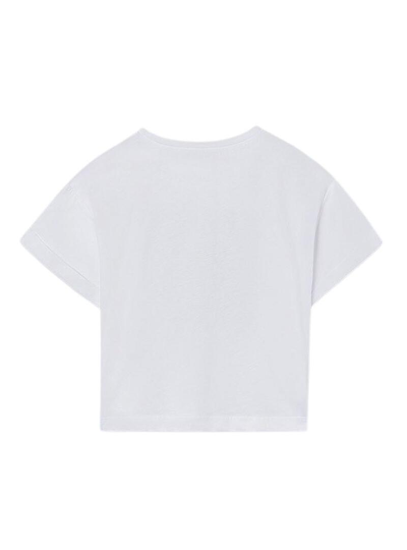 Camiseta Mayoral. Modelo Life is Good. Cor branca. Gola redonda. Manga curta. Ajuste folgado. Ilustração floral estampada na frente com mensagem.