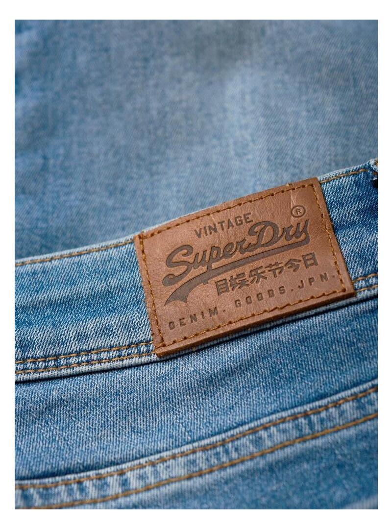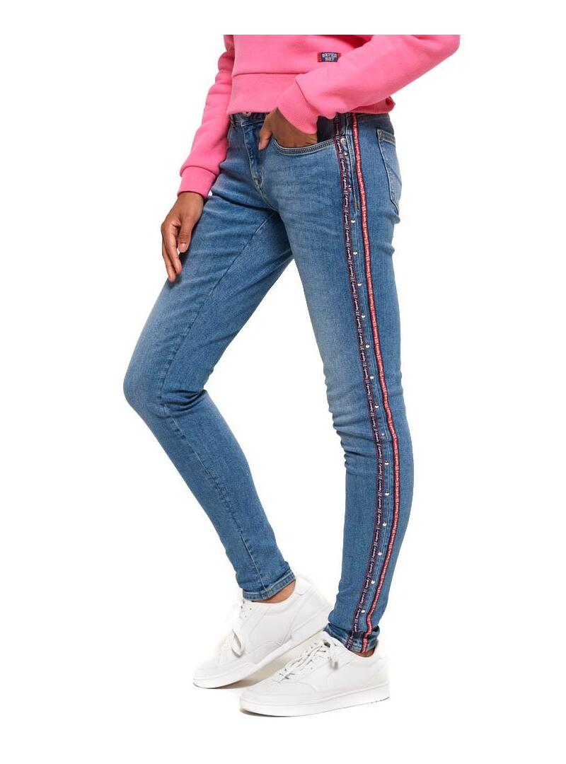 Jeans Superdry. Modelo Cassie. Faixa lateral da marca nas duas pernas. Skinny 5 bolsos Etiqueta de couro nas costas. Logo vintage Superdry no bolso da bolsa. O modelo usa tamanho 27.