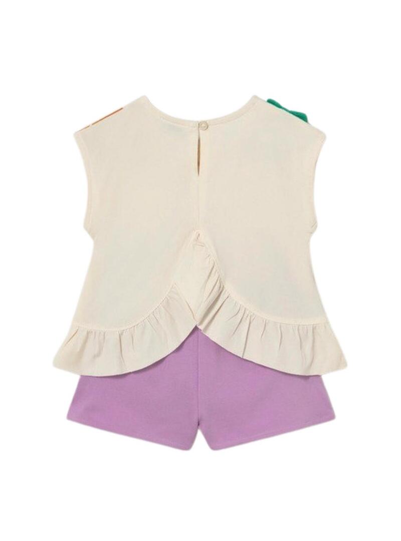 Conjunto Mayoral. Modelo frutas. Top em branco com ilustrações de frutas estampadas. Short lilás com cintura elástica.