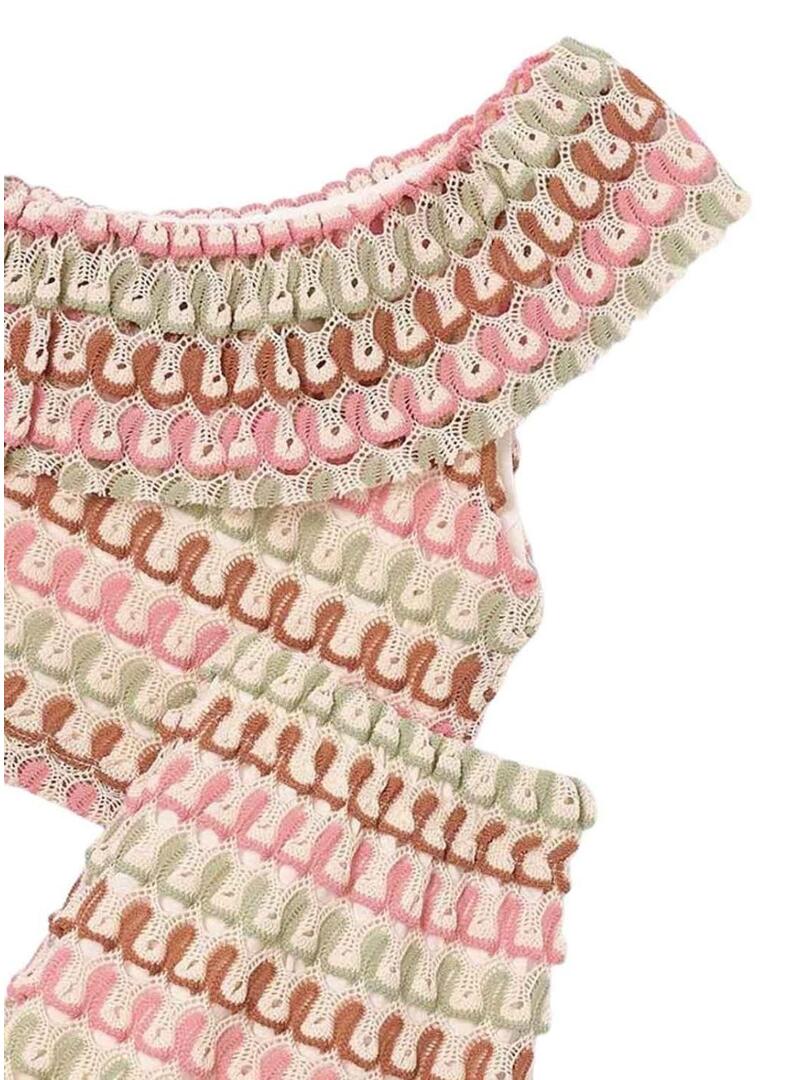 Conjunto Mayoral. Modelo de ponto fantasia. Multicolor. Padrão étnico. Duas peças. Crop top assimétrico com babado. Tecido elástico. Shorts com cintura ajustável por dentro.