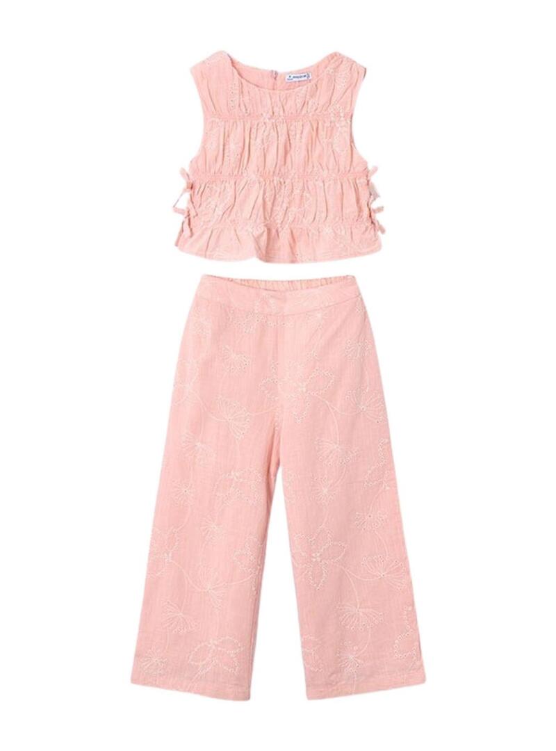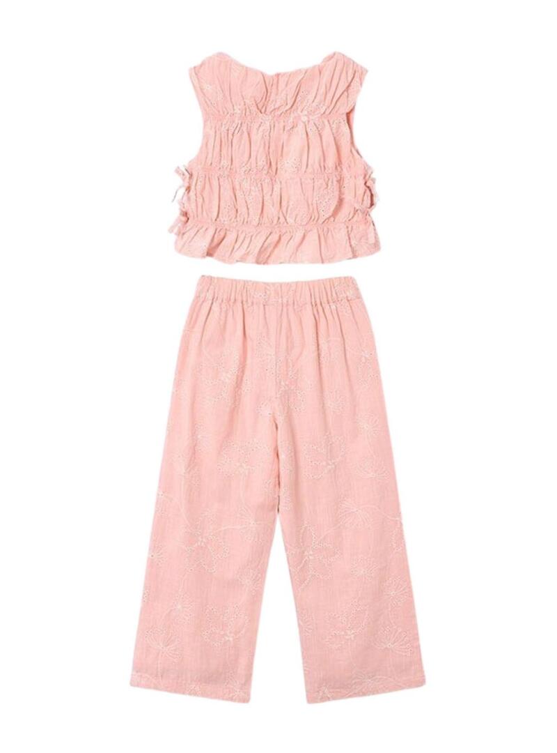 Conjunto Mayoral. Duas peças. Tecido rosa bordado. Gola redonda. Top cropped. Sem mangas. Laços laterais. Calça comprida com elástico.