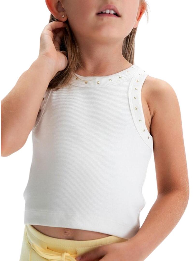 Camiseta Mayoral. Modelo com tachinhas. Cor branco sujo. Gola redonda. Sem mangas. Corte ajustado. Tecido canelado. Estilo regata.