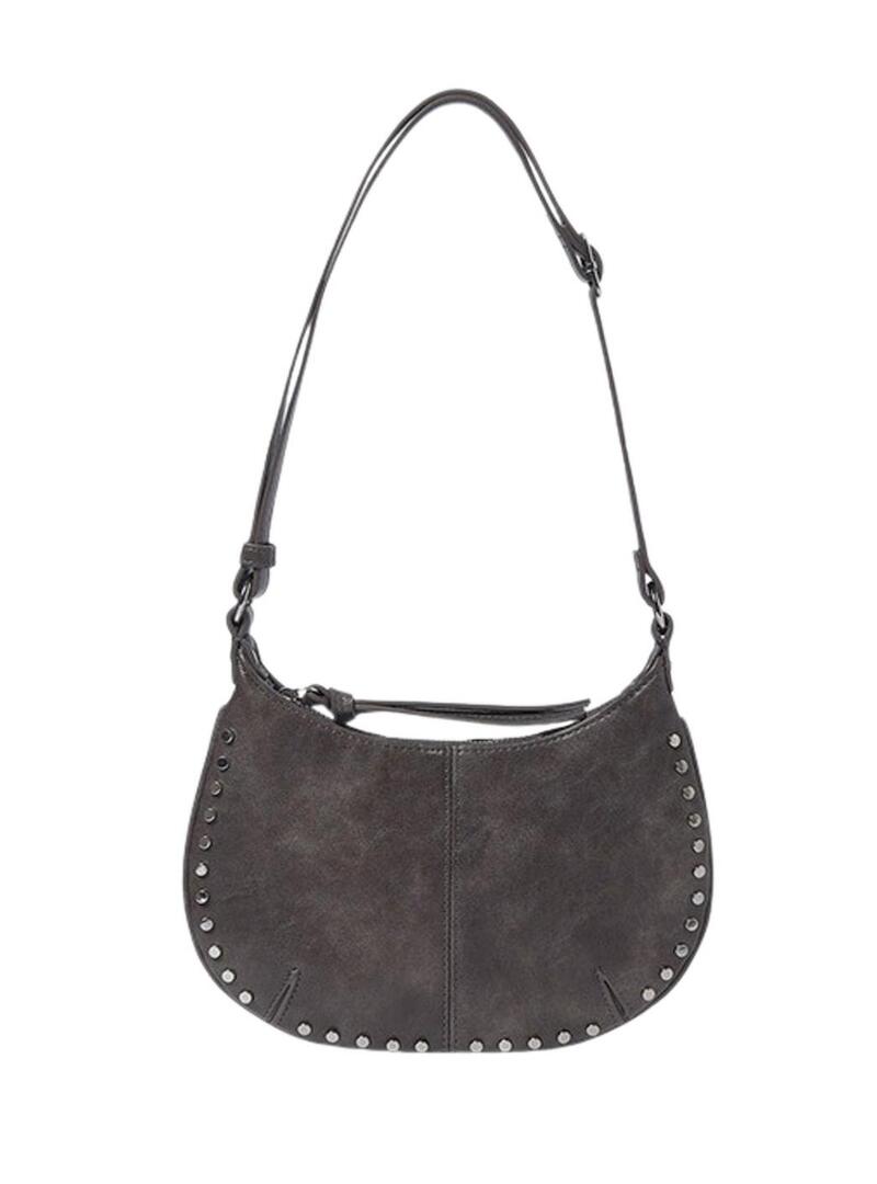 Bolsa Mayoral. Modelo de tachas. Cor antracite. Alça ajustável. Fecho com zíper. Tachas prateadas. Costura central. Formato de meia lua.