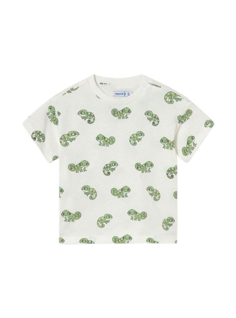 Conjunto Mayoral de três peças em tons suaves, ideal para os primeiros looks de verão. Inclui uma camiseta lisa em cor creme com estampa frontal de camaleão e mensagem, uma camiseta estampada com desenho de camaleões e um bermuda lisa em cor verde.