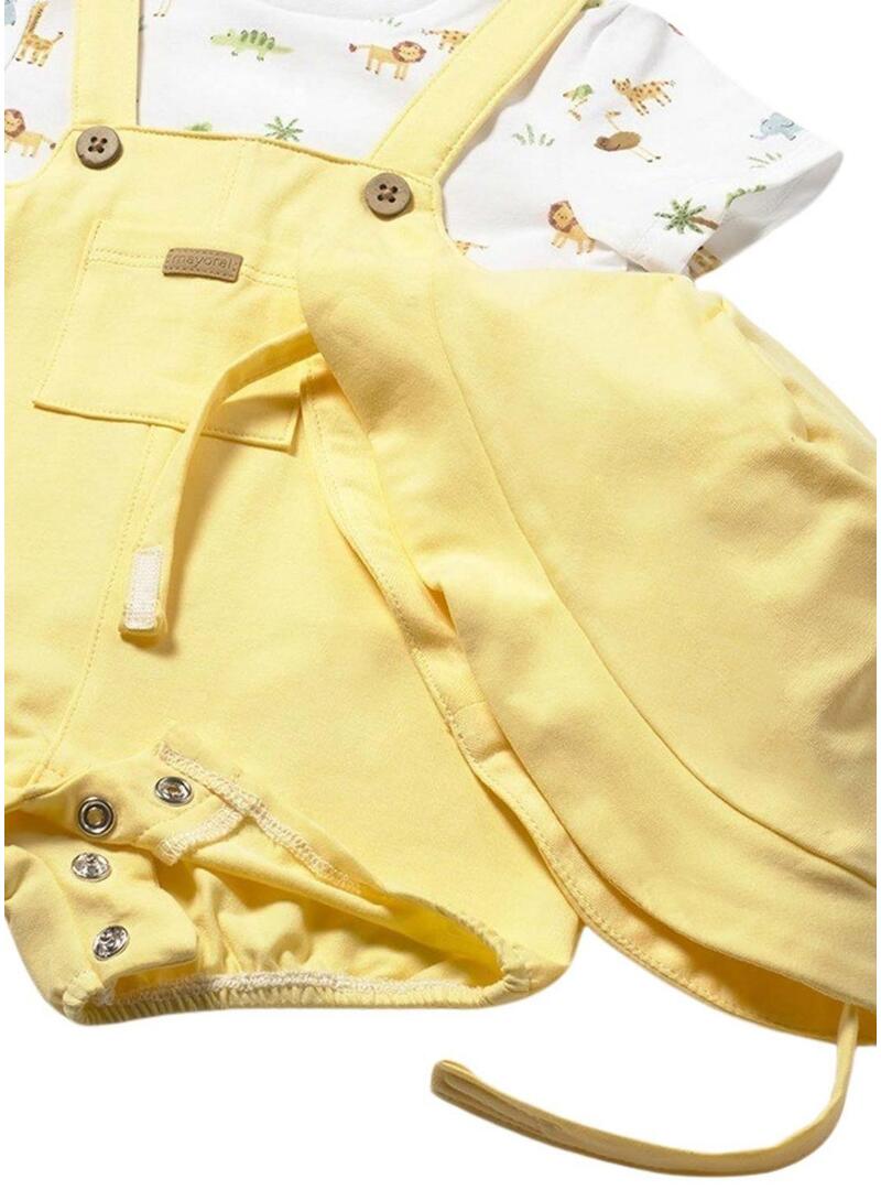 Conjunto Mayoral em amarelo, ideal para vestir o bebê com um visual alegre e de verão. Inclui camiseta de mangas curtas com estampa de safari, jardineira curta lisa com bolso frontal e um chapéu combinando para completar o conjunto. Seu design leve e confortável o torna uma opção perfeita para dias quentes, proporcionando liberdade de movimento e um estilo muito fofo. Um conjunto prático e fácil de usar no dia a dia.