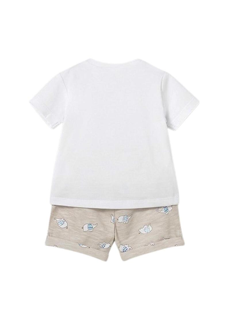 Conjunto de verão Mayoral com dois looks em tons de branco, azul e bege, perfeito para o bebê. Inclui duas camisetas de manga curta com detalhes bordados de elefantes e duas bermudas combinando, uma estampada e outra lisa. Seu design confortável e leve é ideal para o dia a dia, permitindo criar diferentes combinações com um estilo fofo, fresco e muito prático.