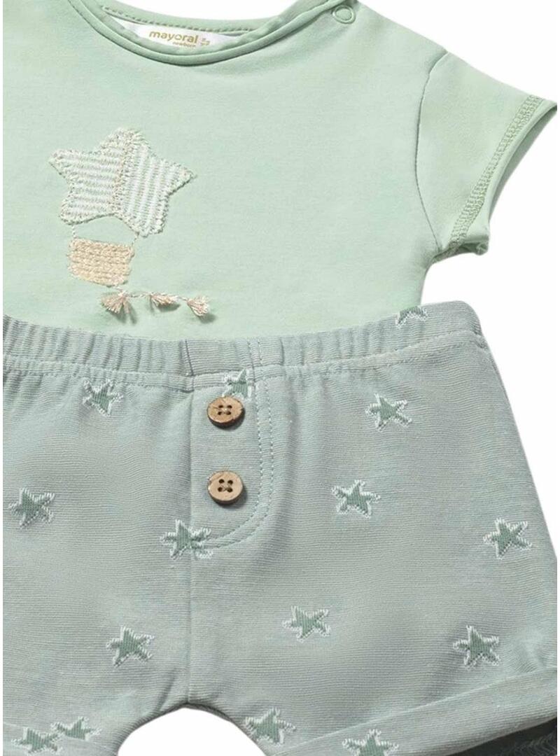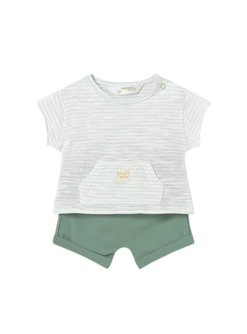 Conjunto Mayoral com dois looks em tons de verde água, ideal para vestir o bebê com conforto e estilo doce nos dias quentes. Inclui duas camisetas de manga curta, uma lisa com desenho bordado e outra listrada com bolso frontal, combinadas com duas bermudas combinando.