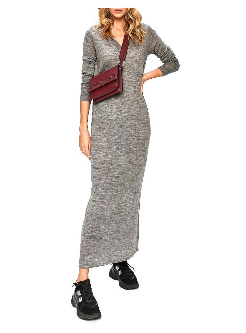 Vestido Pepe Jeans. Modelo Marula. Cor cinzenta. Tecido fino. Formato midi. Manga comprida. Regular fit Decote em V. Placa de metal con o logotipo. A modelo está usando tamanho S.