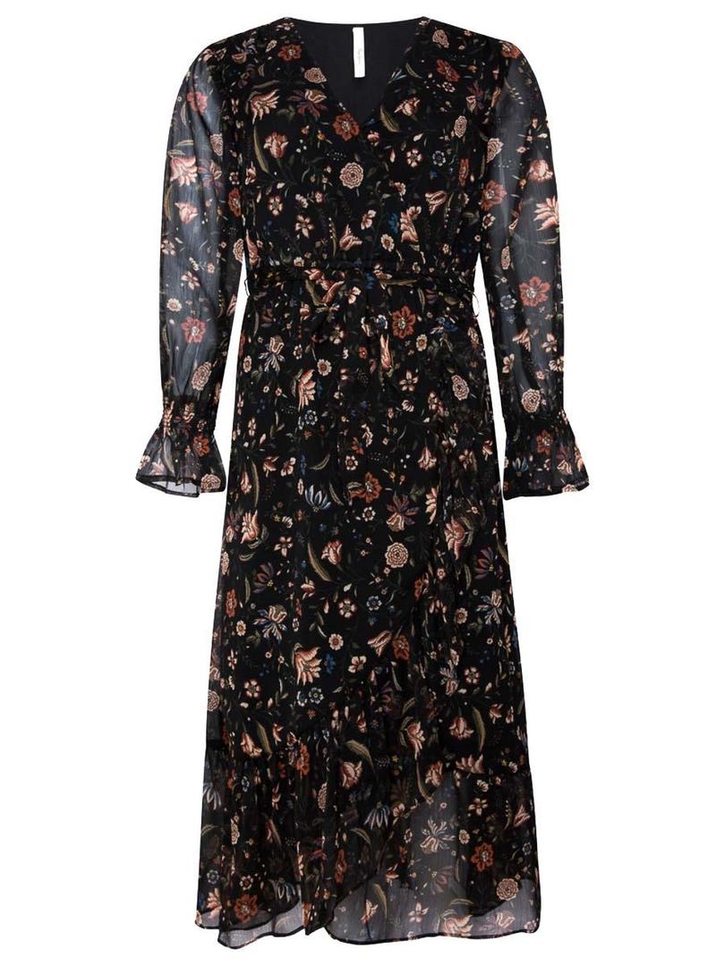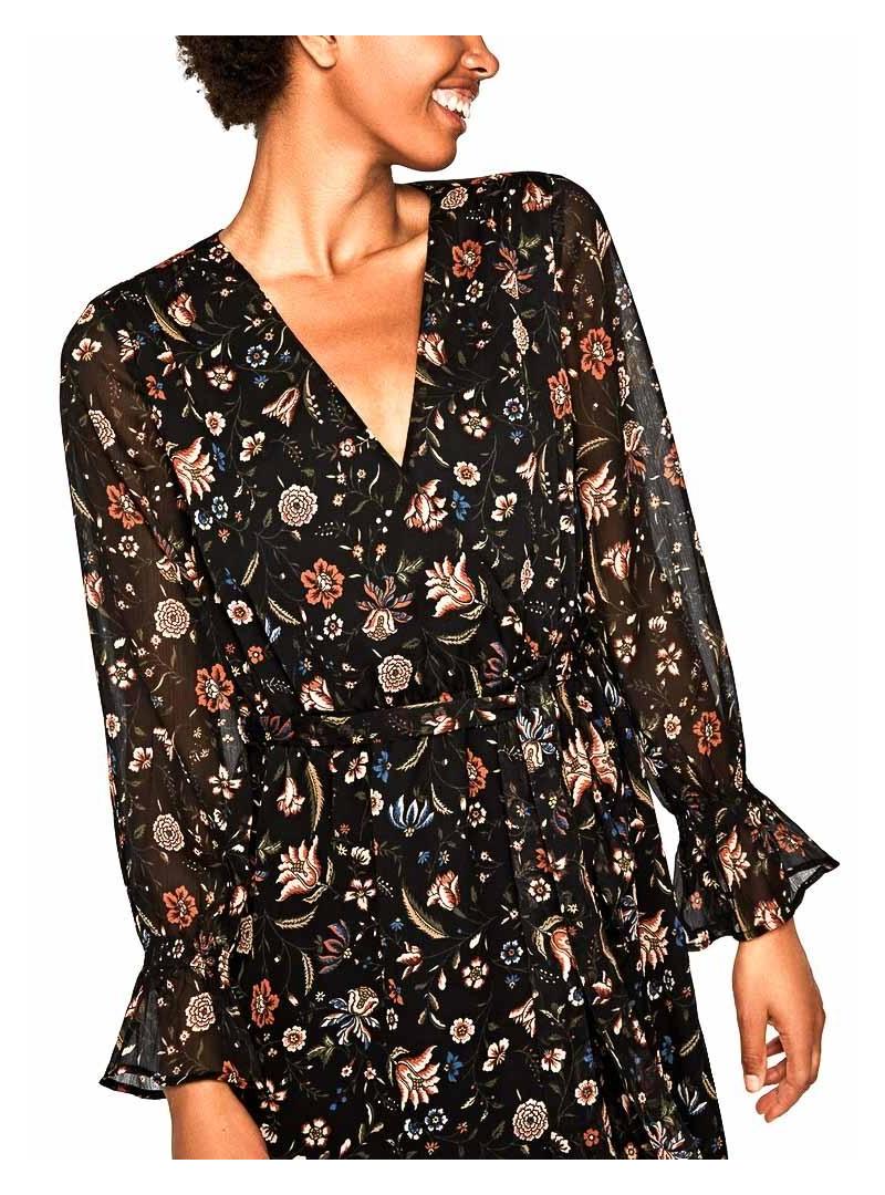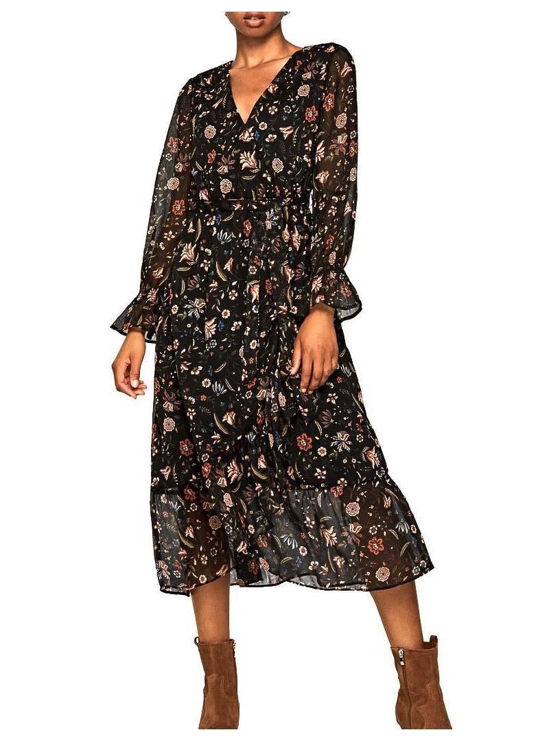 Vestido Pepe Jeans. Modelo Anette. Estampado floral. Formato midi. Tecido vaporoso Cós de borracha Decote cruzado. Detalhe de babados. Manga comprida. Desigual baixo. Regular fit .. A modelo está usando tamanho S.