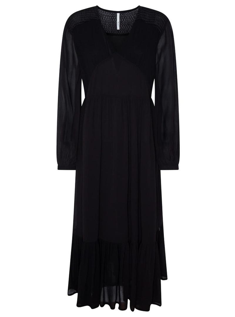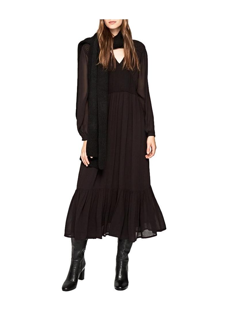 Vestido Pepe Jeans. Modelo Bianca. Cor preta. Formato midi. Tecido leve. Decote em V. Detalhe do favo de mel. Sob folhetos con. Manga longa semi-transparente. Estilo Boho. A modelo está usando tamanho S.