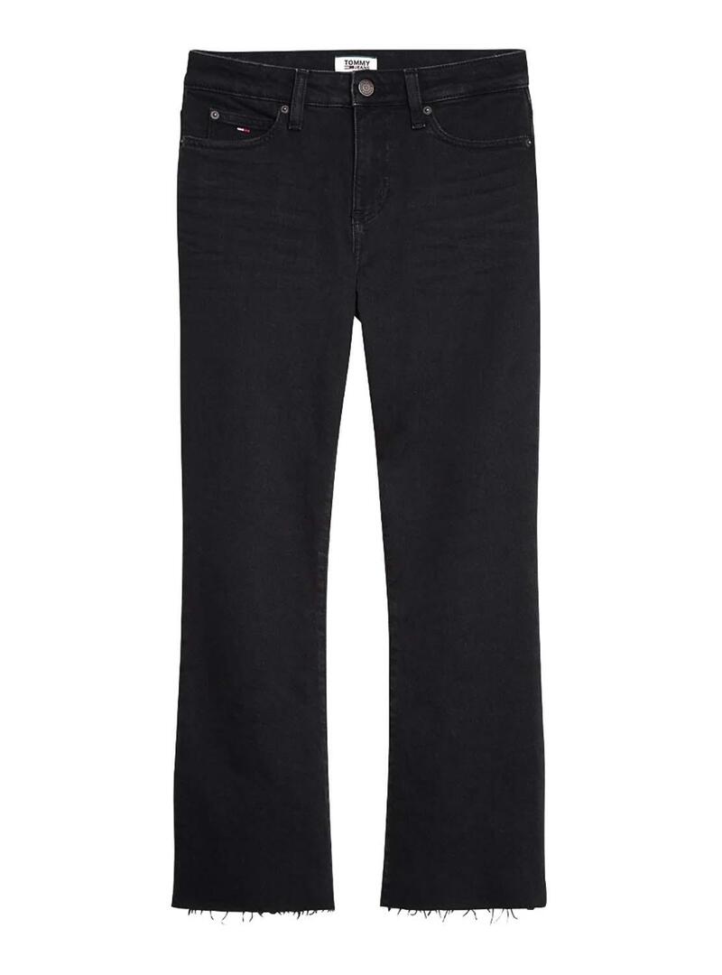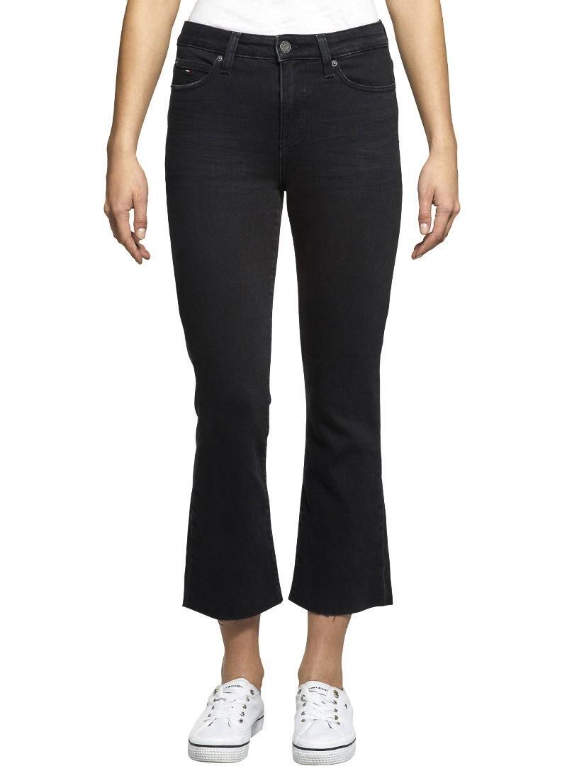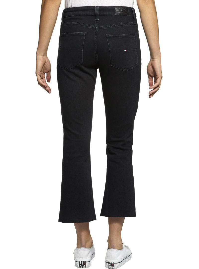 Jeans Jeans Tommy. Formato Crop. Sob queimado. Ajustado nas coxas. Cintura alta Cor preta. Bandeira da marca em dois bolsos. O modelo está usando tamanho 27.
