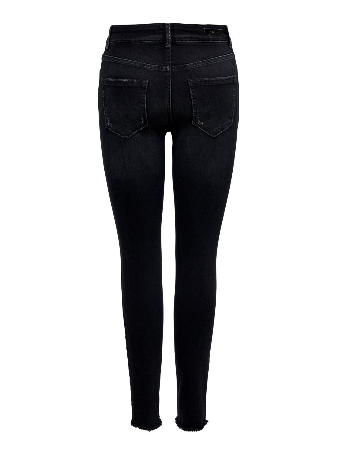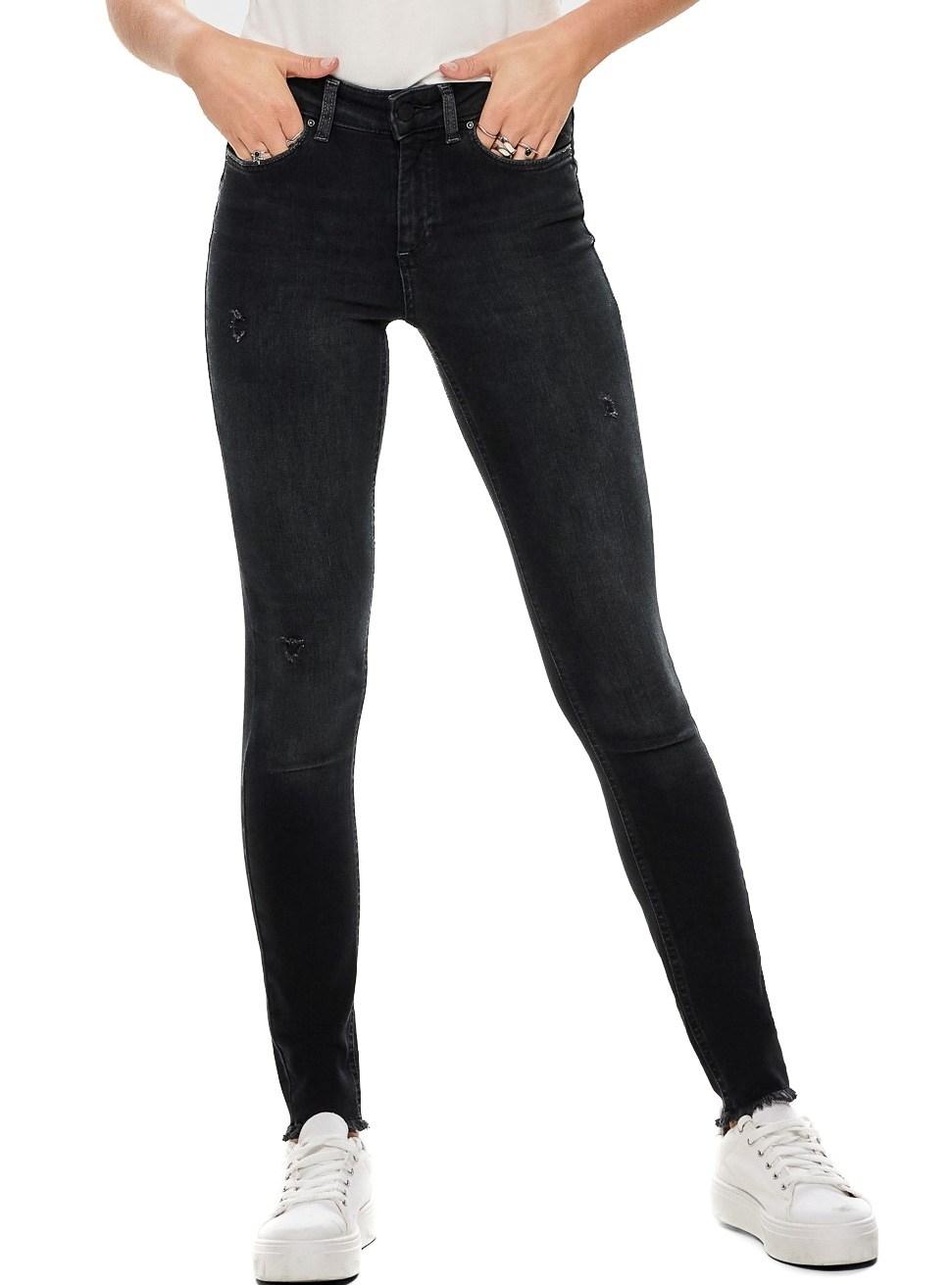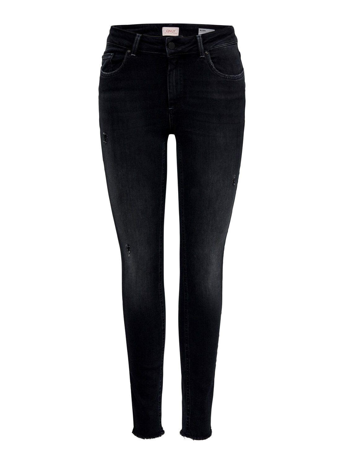Jeans Only. Modelo Blush. Cor preta. Mid rise. Fecho de botão e zíper. Efeito desgastado Cinco bolsos Baixo inacabado. Ajuste Skinny.