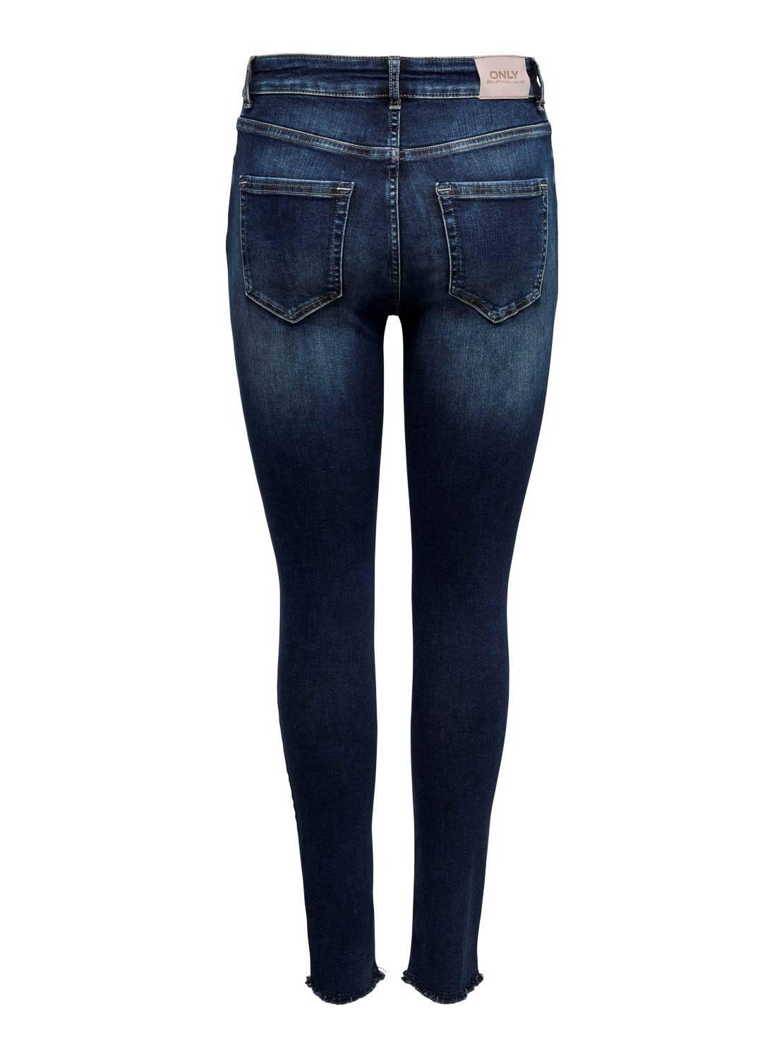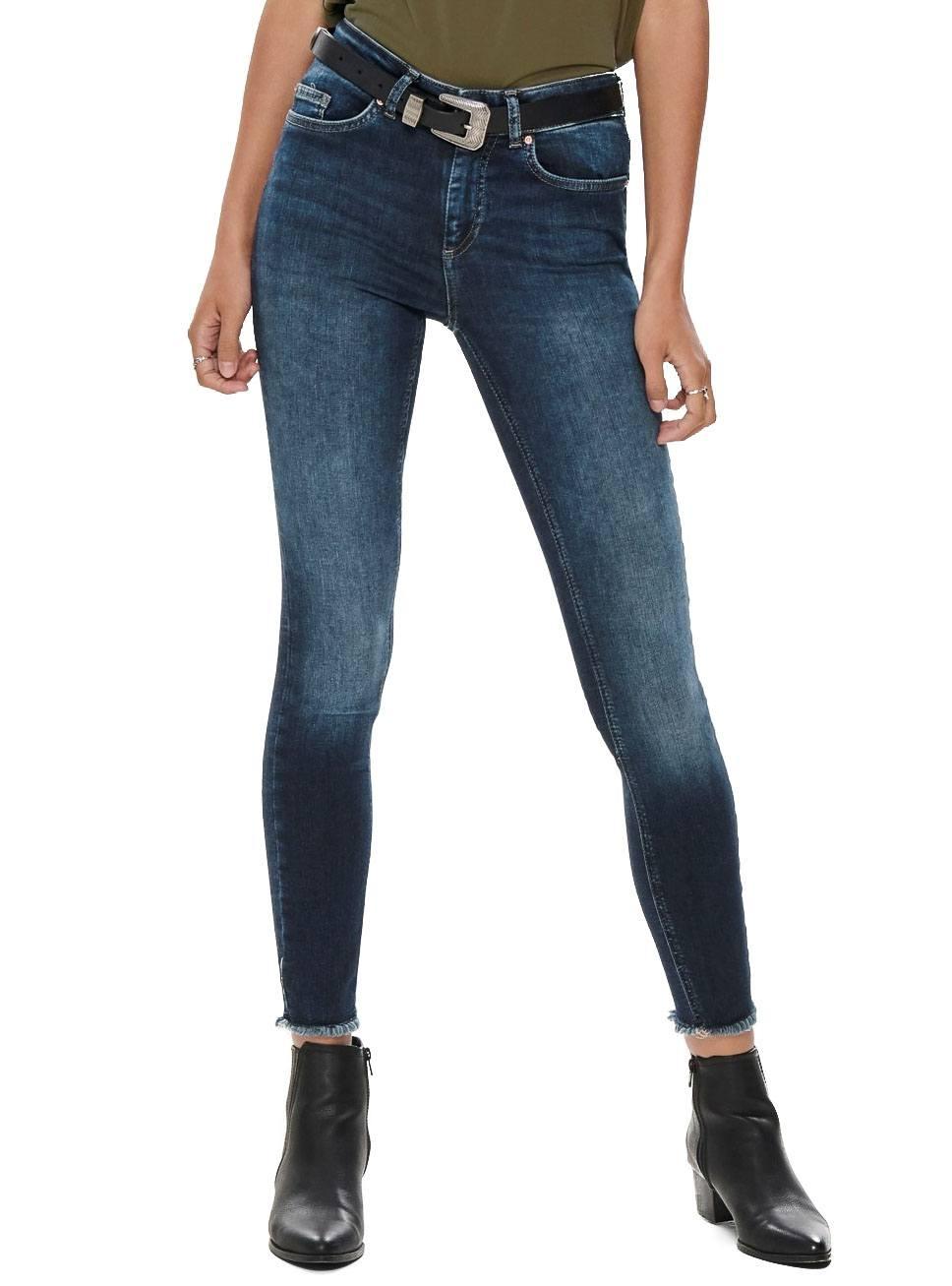 Jeans Only. Modelo Blush. Jeans escuro. Cintura alta. Fecho de botão e zíper. Cinco bolsos Baixo inacabado.