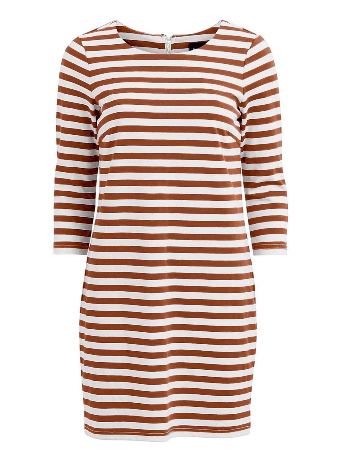 Vestido da Vila. Modelo Tinny. Estampado de listras de camel. Decote de largura. 3/4 manga. Corte em linha reta.