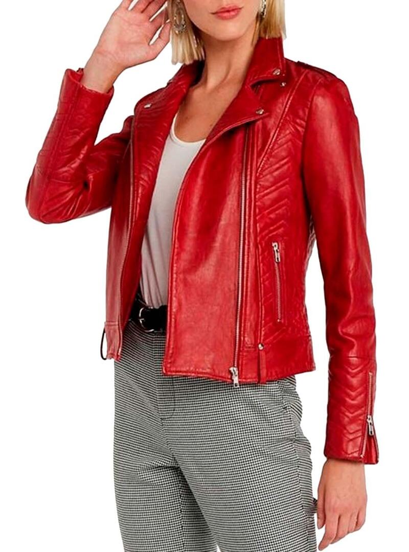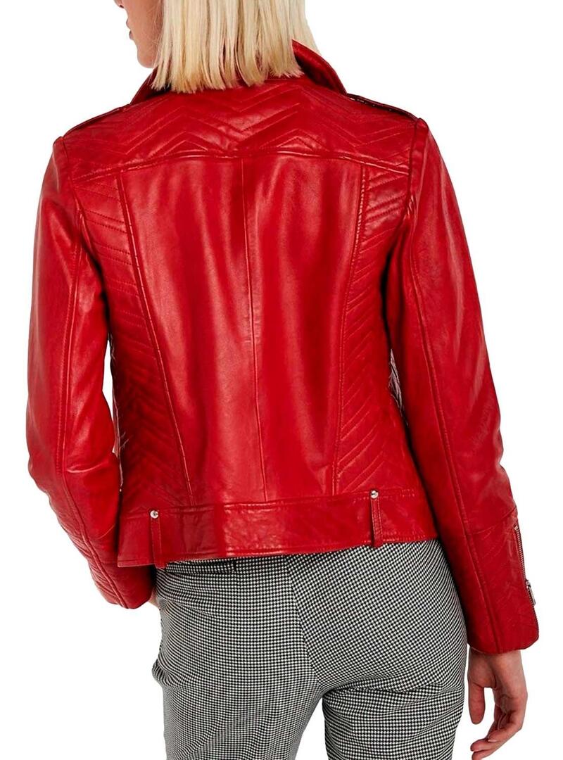 Casaca Naf Naf. Estilo motociclista De coiro. Cor vermelha Manga comprida. Aba Decote. Fecho con zíper. Bolsos laterais con zíper. O detalhe do botão está na aba. Gravuras em todo o vestuário. O modelo está usando tamanho 36.