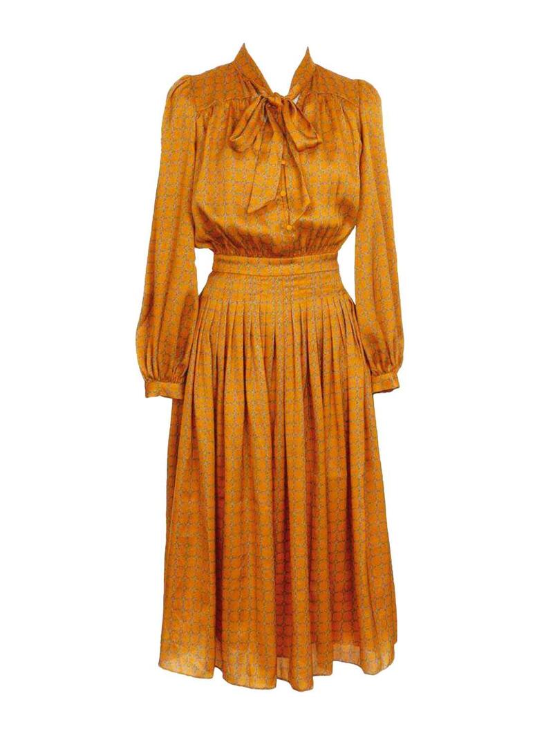 Vestido Naf Naf. Cor amarelo. Estampado. Manga comprida. Decote pico. Laço do mesmo tecido para amarrar no pescoço. Botões na frente. Borracha na cintura. Tecido acetinado. Formato midi. O modelo está usando tamanho 36.