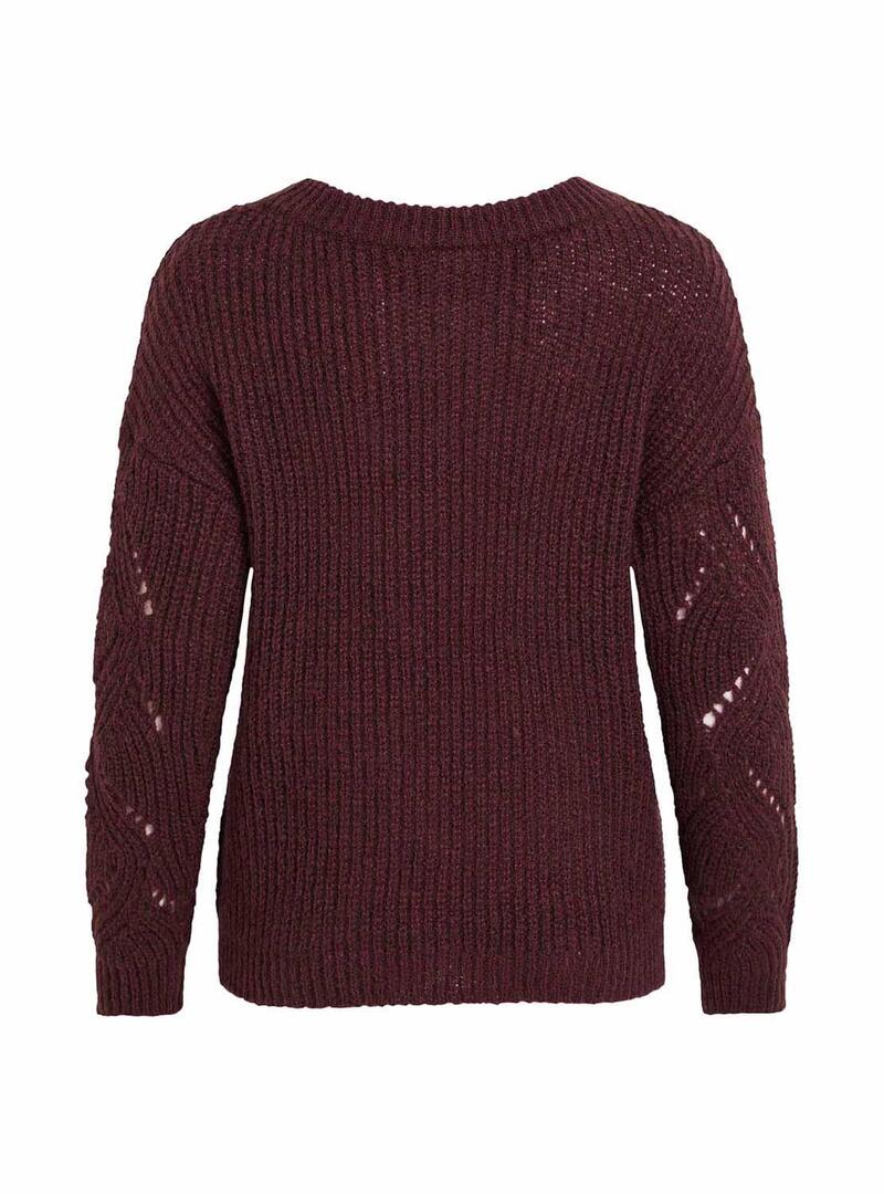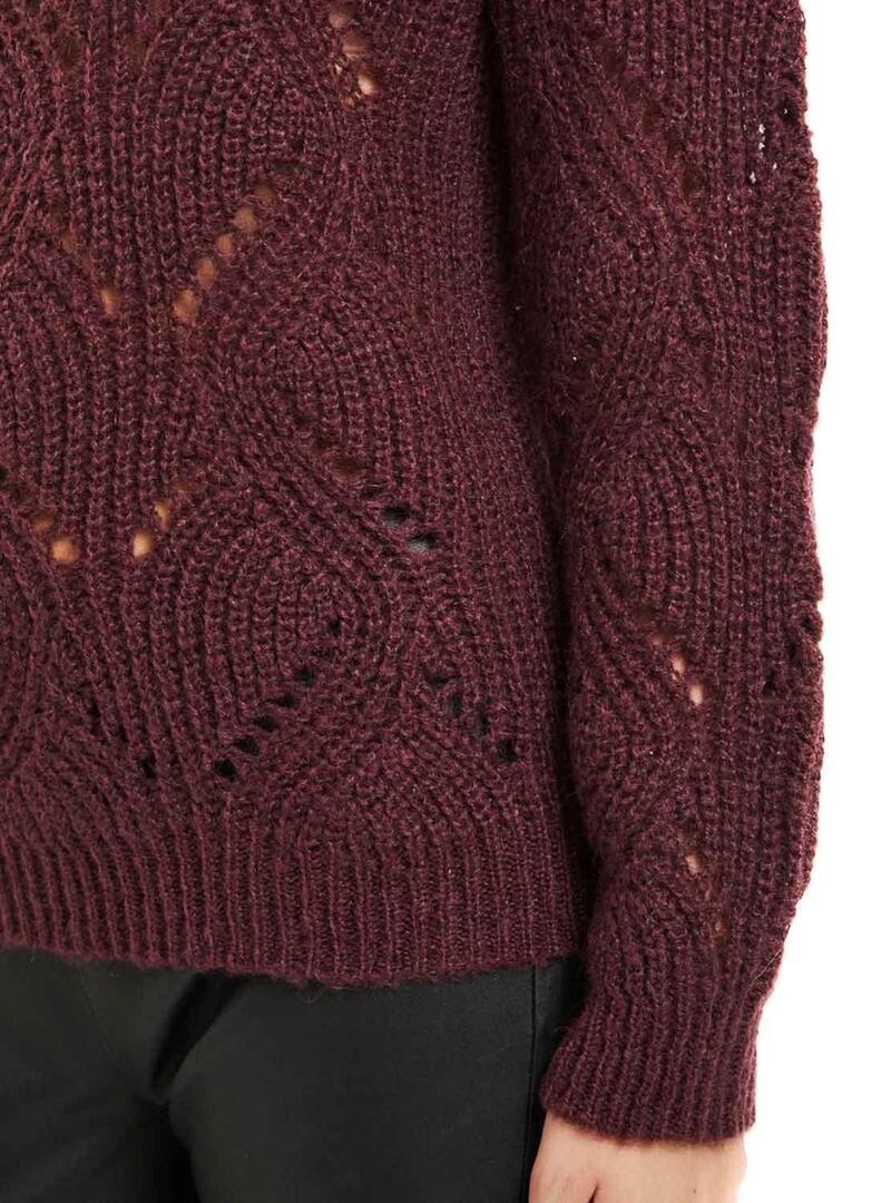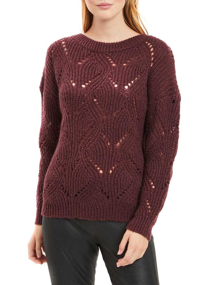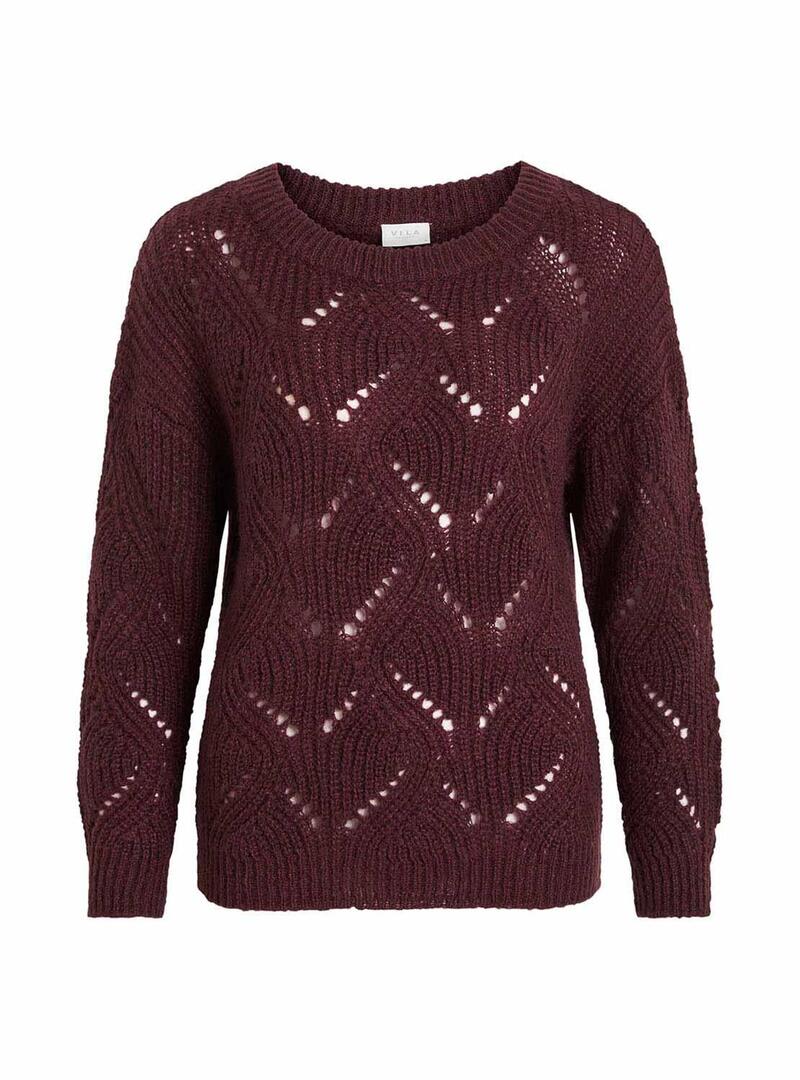 Camisola Vila. Modelo Vigaze. Cor granada. Pescoço redondo. Manga comprida. De malha. O modelo usa tamanho M.