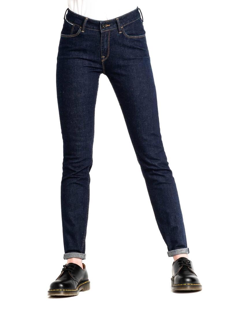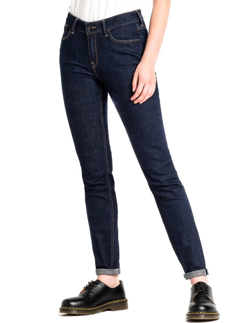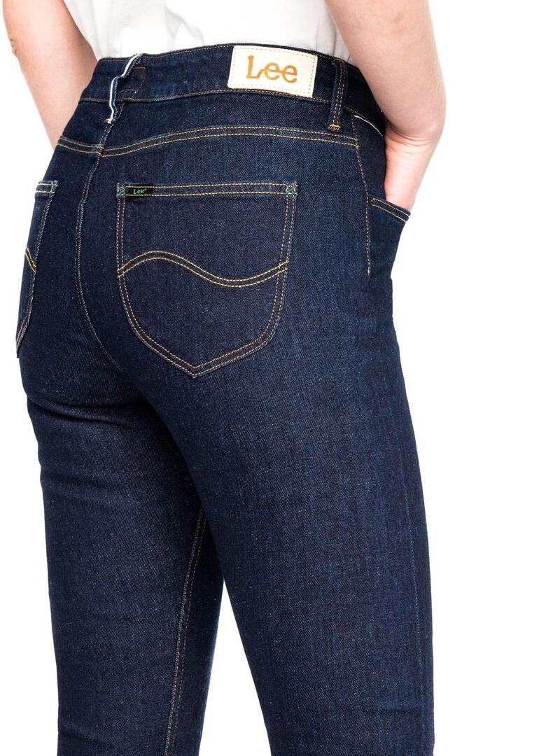 Jeans Lee. Modelo Scarlett Rinse. Jeans escuro. Fecho de botão e zíper. Ajuste Skinny. mid rise. Cinco bolsos. Remendo de marca na cintura.