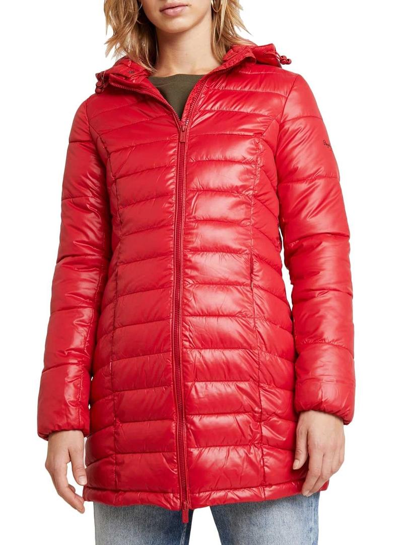 Casaca Pepe Jeans. Modelo Alice. Cor vermelha Fecho de zíper. Capuz ajustável. Corte ajustado. Dois bolsos laterais. Logotipo estampado na manga. Longo pela coxa.