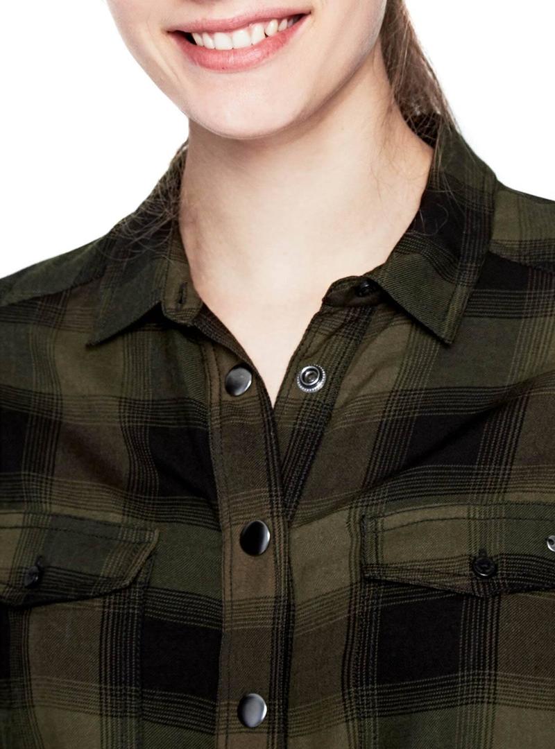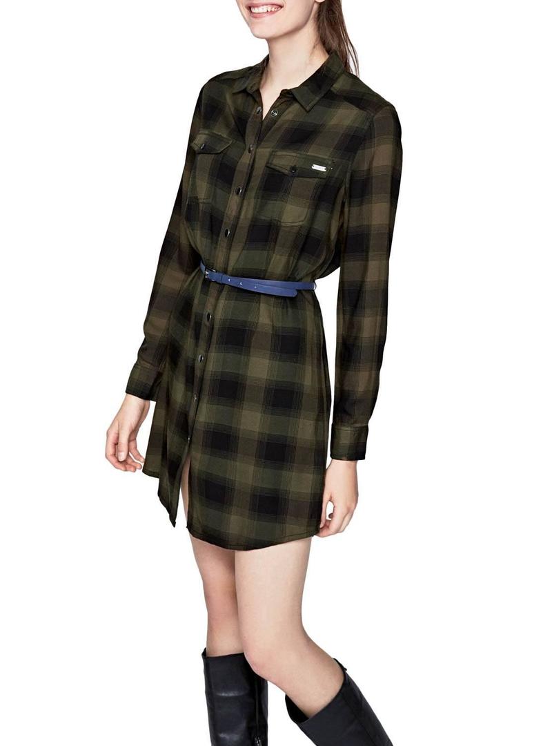 vestido Pepe Jeans. Modelo Violoncelo. Estampado de quadrados verdes e pretos. O Fecho do botão é automático. Remendar bolsos no peito. Baixo arredondado. Faixa azul ajustável. peito de metal logotipo.