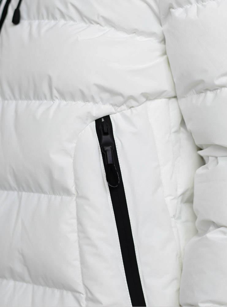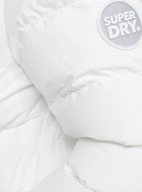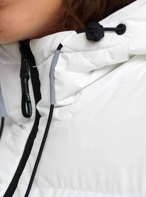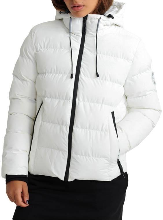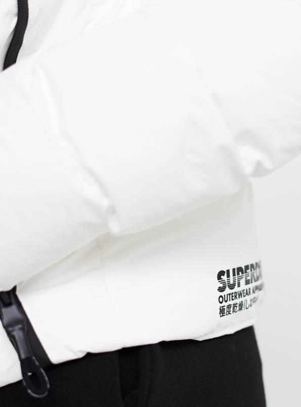 Jaqueta Superdry. Modelo Espírito. Cor branca. Capuz com atacadores ajustáveis. Fecho de correr. Dois bolsos frontais com fecho. Patch de borracha com o logotipo Superdry em uma manga.