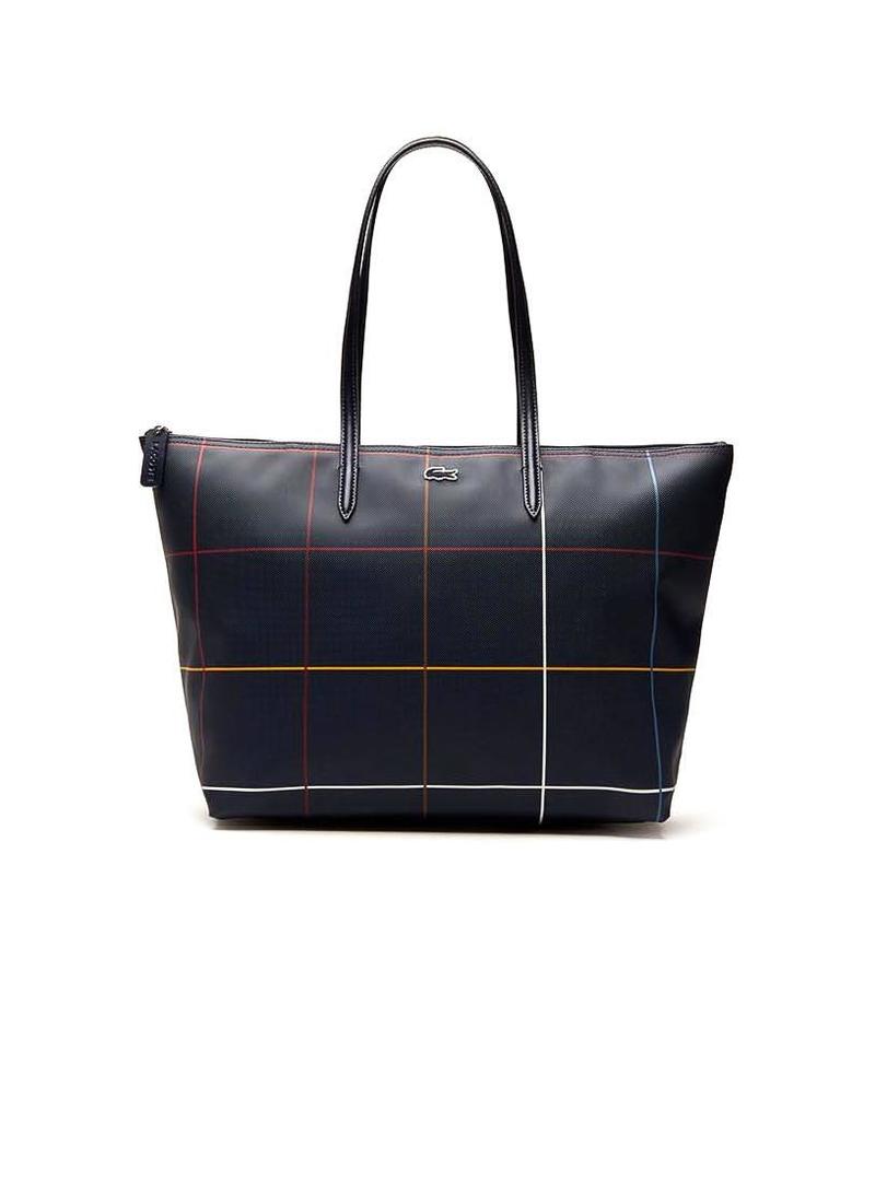 Saco Lacoste. Modelo Tote. Cor azul marinho. Estampado geométrico multicolorido. Fecho zíper. Alça de ombro dupla. Bolso interior con zíper. Forro de malha. Fita monográfica