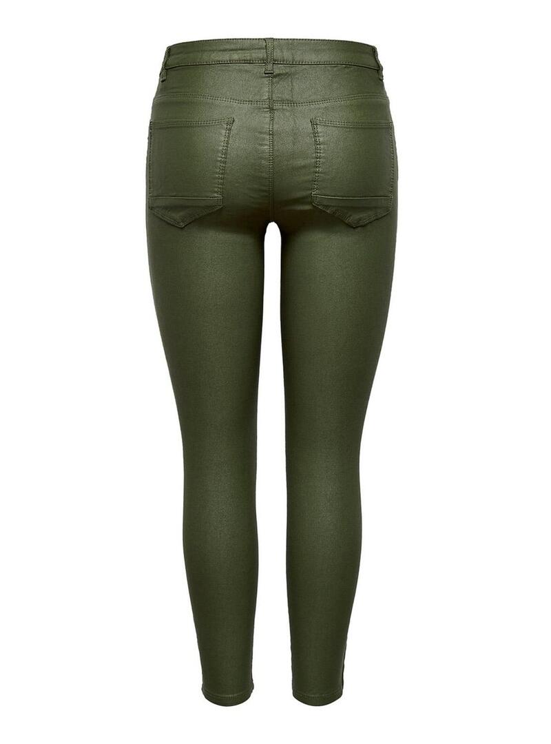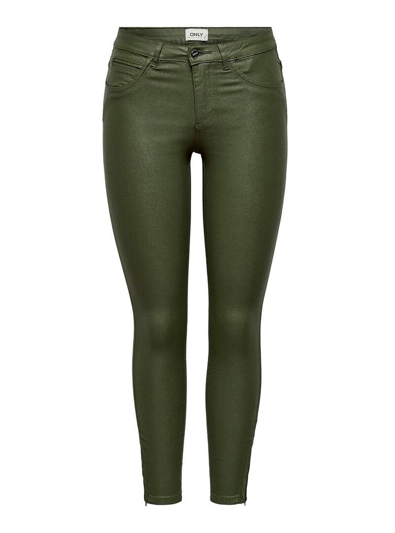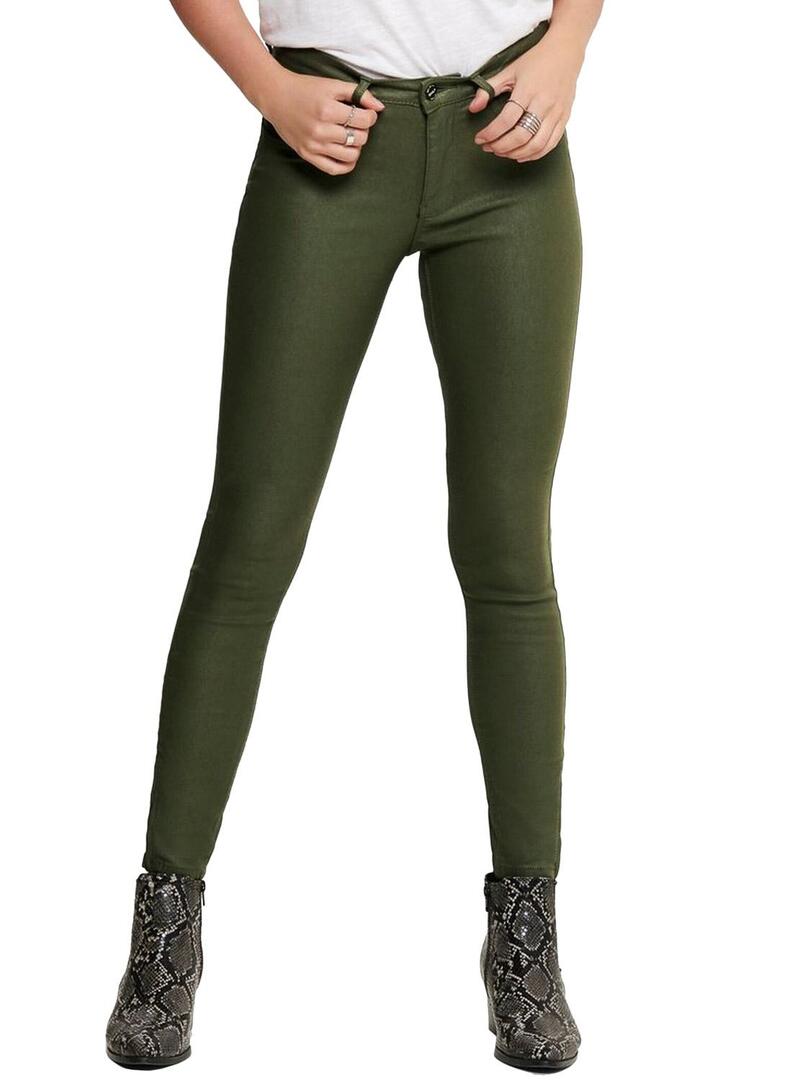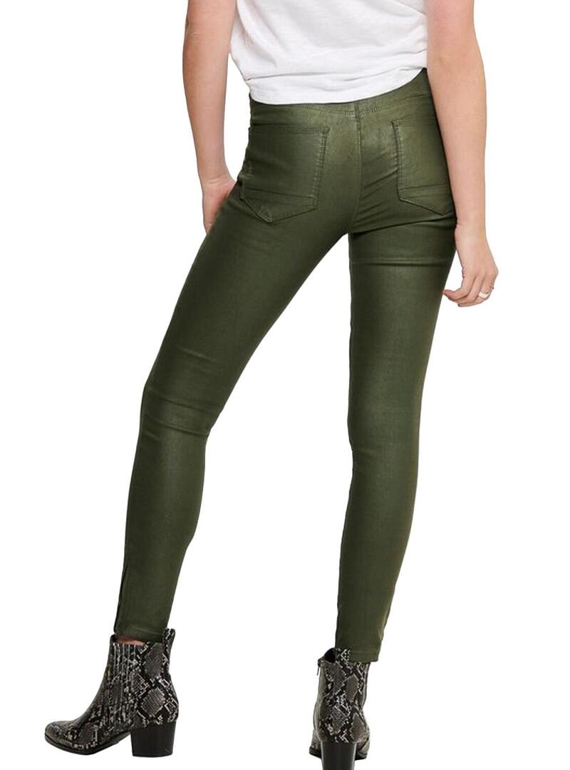 Calças Only. Modelo Kendell Coated. Cor verde. Ajuste Skinny. Cinco bolsos Tecido encerado.