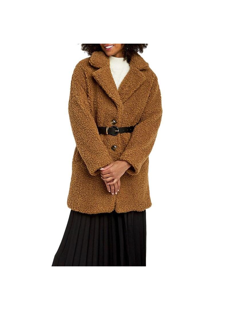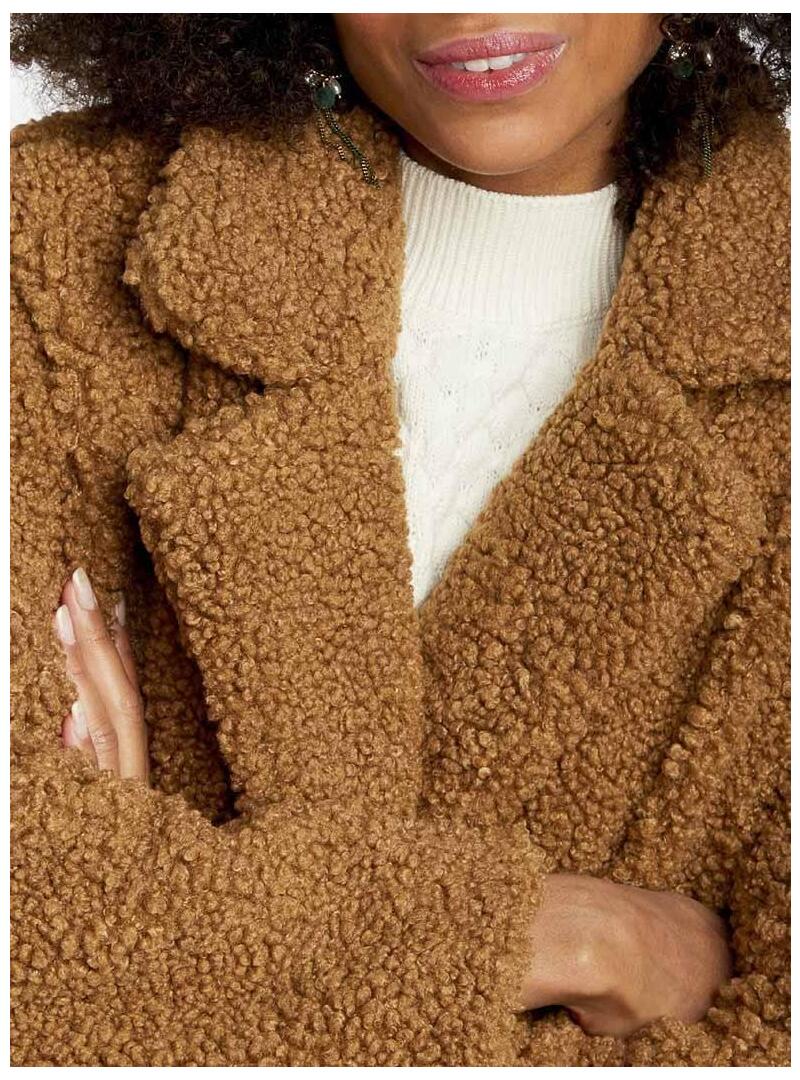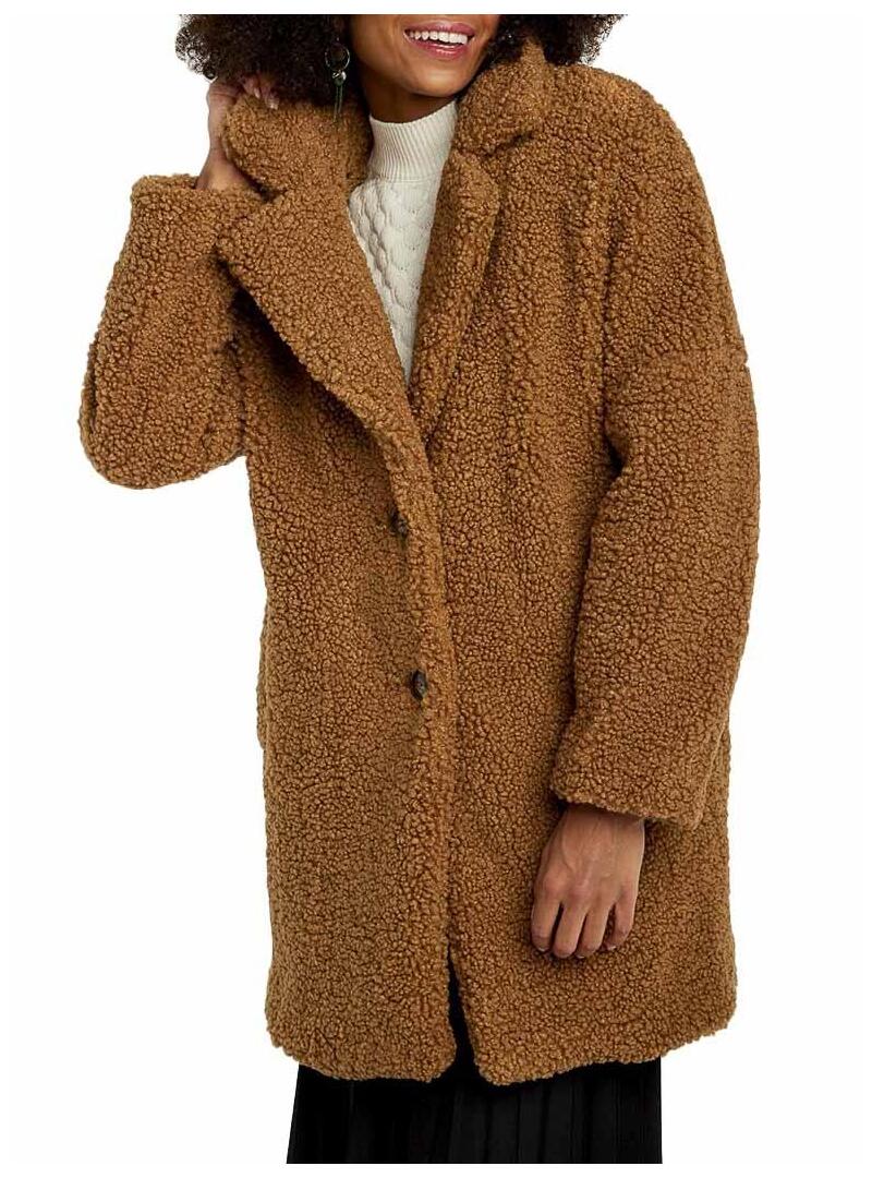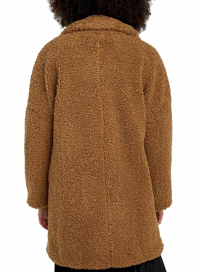 Casaco Naf Naf. Modelo Ondulação. Cor Camel. Fecho de botãoes. Ombro caído. Ajuste solto. Aba de tamanho grande. Longo pelo quadril. Dois bolsos laterais.