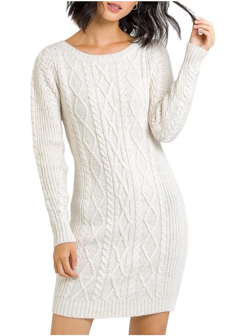 Vestido Naf Naf. Modelo Tricot. Cor bege. Decote redondo. Extremidades com nervuras. Tecido trançado. Corte apertado. Corte mini.
