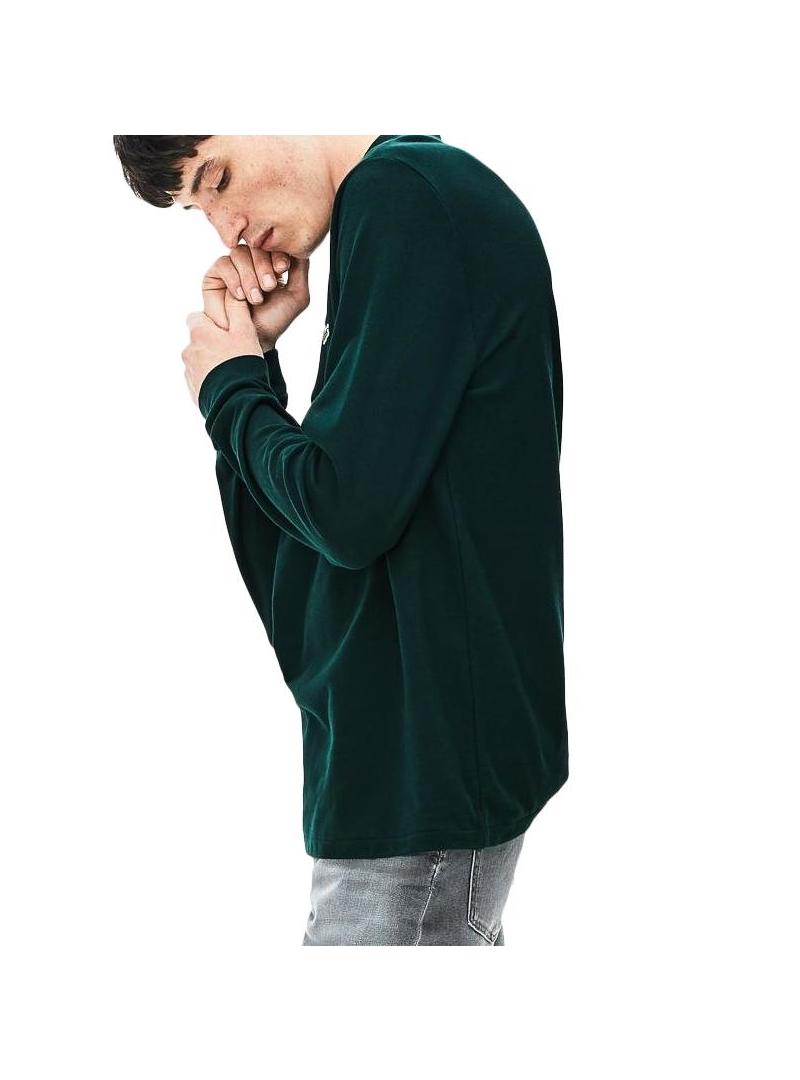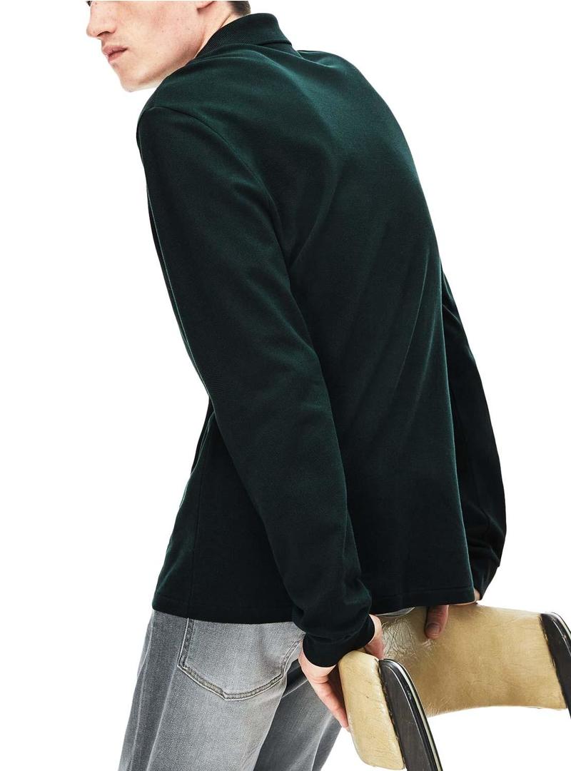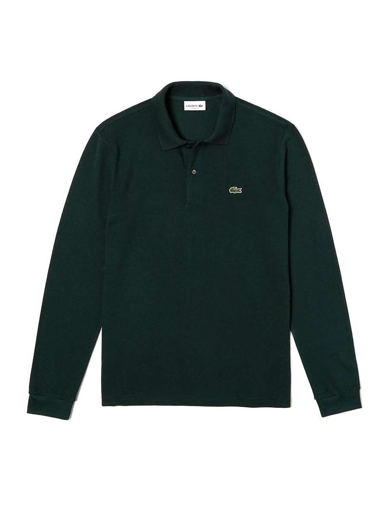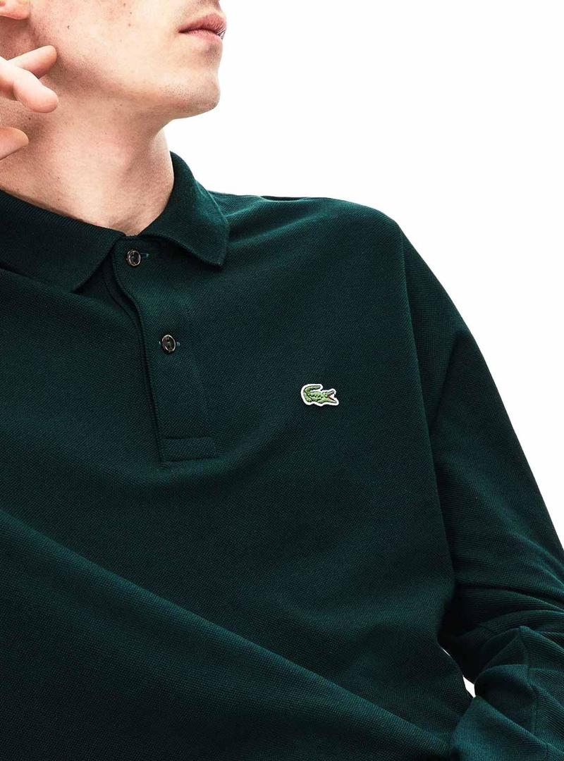 Polo Lacoste. Modelo L1312. Cor verde. Manga comprida. Decote con 2 botãos. Crocodilo bordado no peito. Regular fit A modelo está usando tamanho 4.