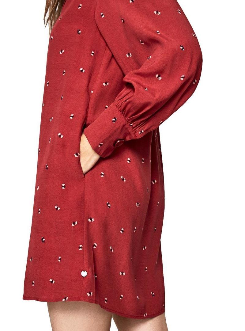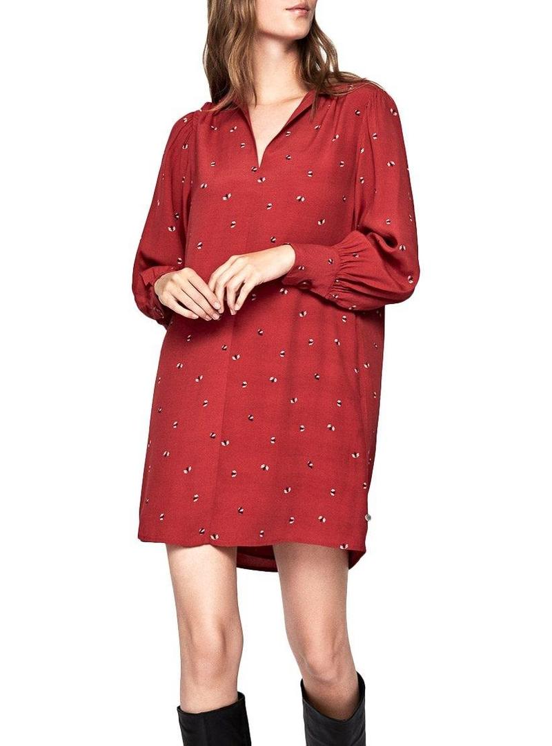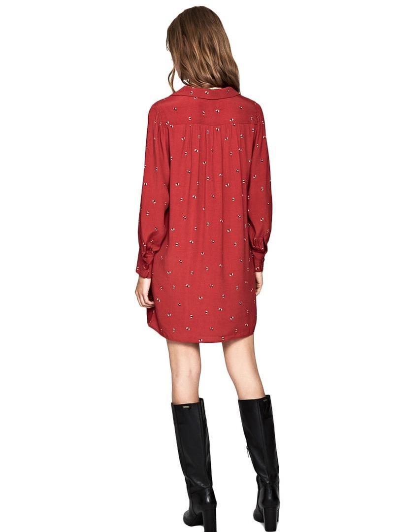 Vestido Pepe Jeans. Modelo Louise. Cor vermelha. Manga comprida. Estampado de flores. Manga tufada.
