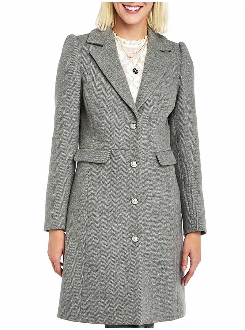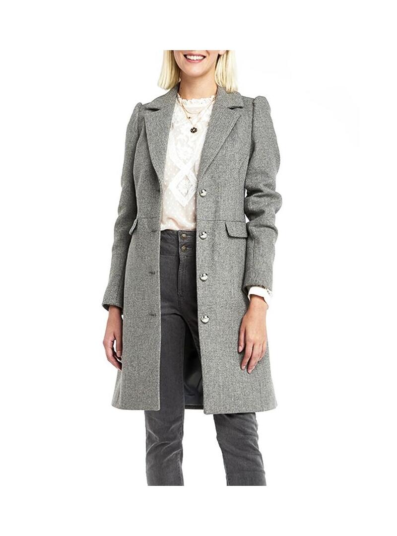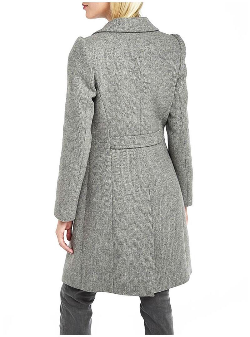 Casaco Naf Naf. Modelo Alfaiate. Cor cinzenta. O Fecho do botão é metálico. Dois bolsos laterais Tecido marmorizado. Ajuste regular. Longo pelo joelho.