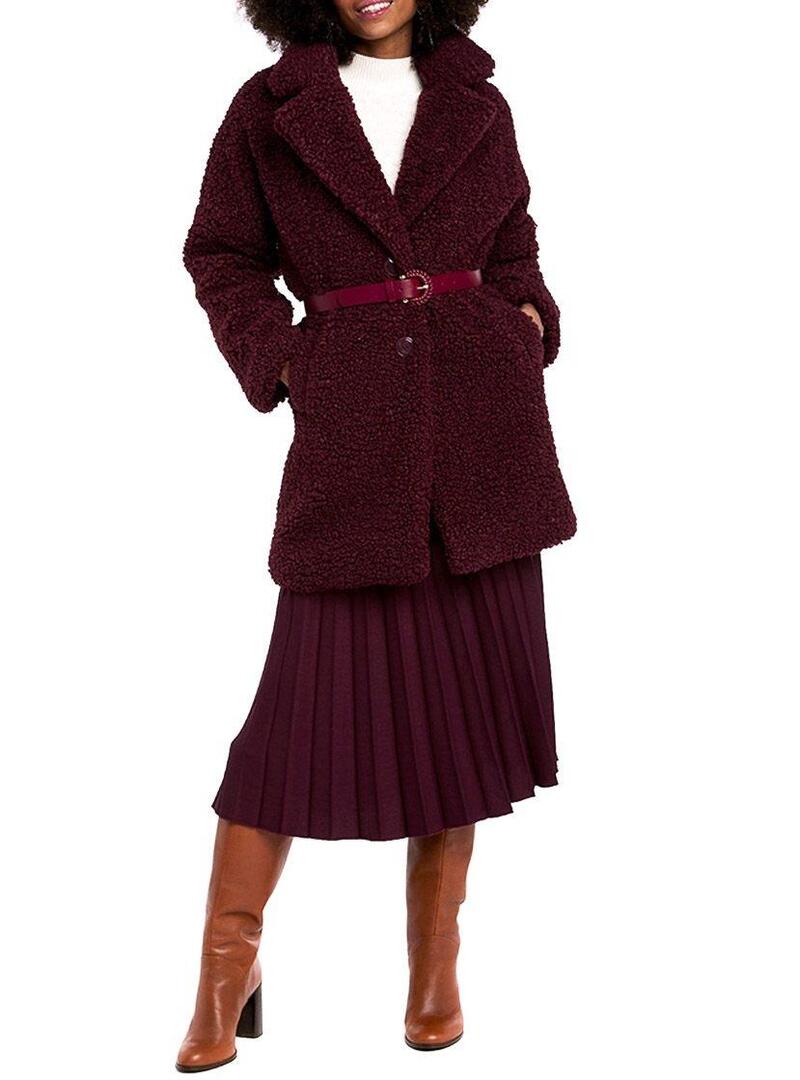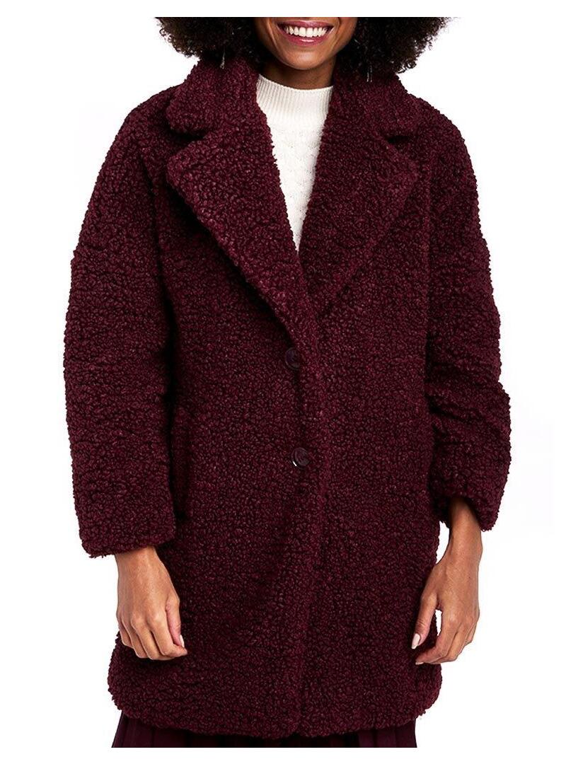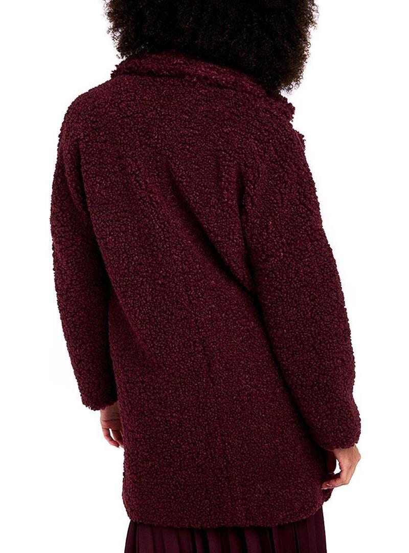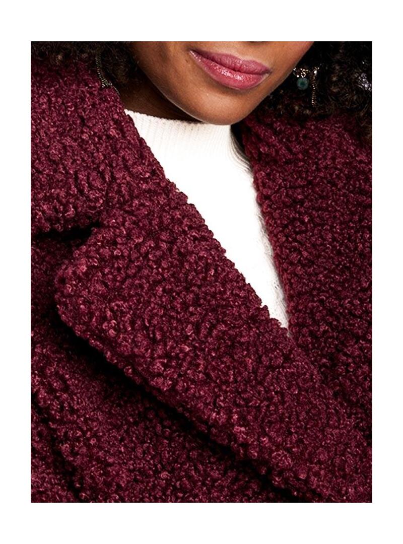 Casaco Naf Naf. Tecido ondulado. Cor granada. Fecho con dois botãoes. Ombros caídos. Corte folgado. Retalhos de grandes dimensões. Longo pelo quadril. Dois bolsos laterais O modelo está usando tamanho 36.