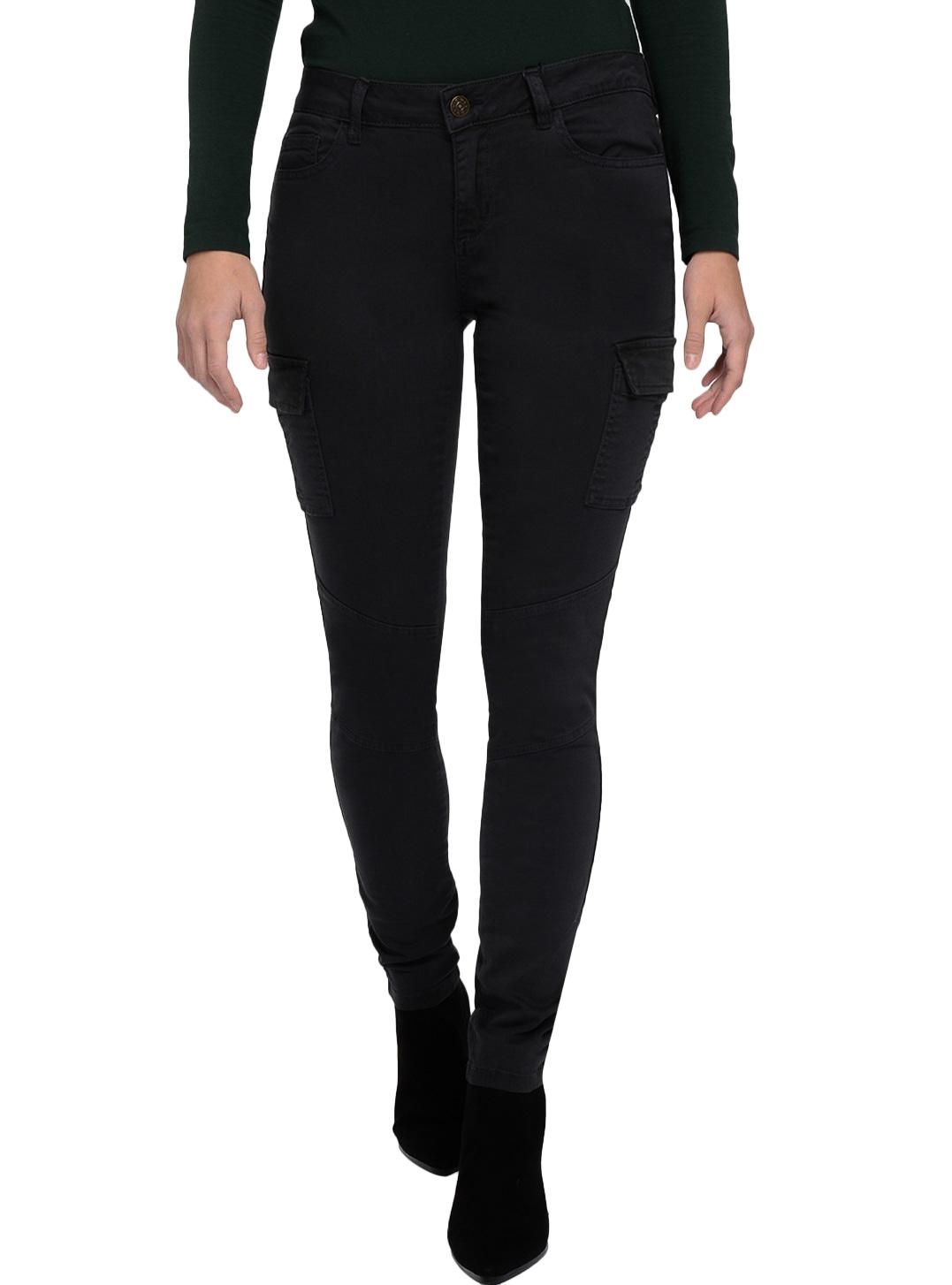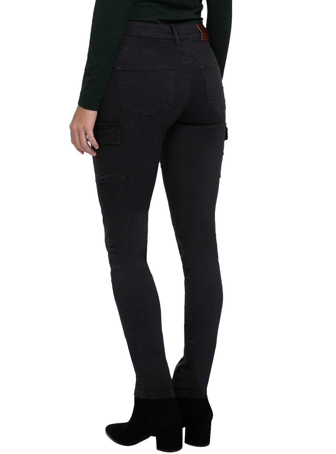 Calças Only. Modelo Cece. Cor cinzenta. Cinco bolsos Formato Skinny. Bolsos laterais. O modelo está usando tamanho 36.