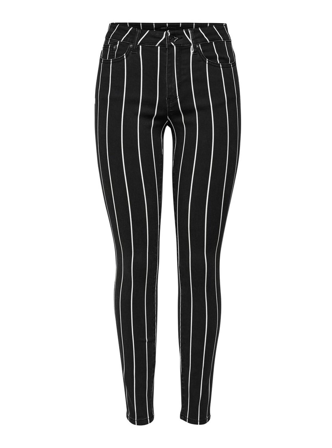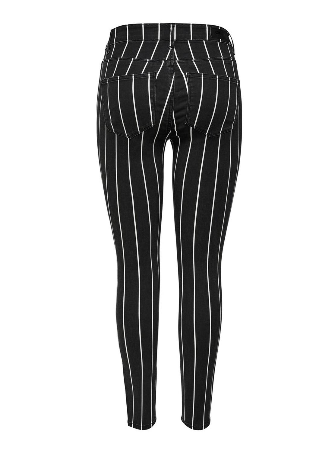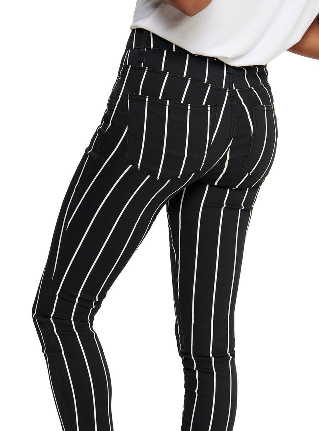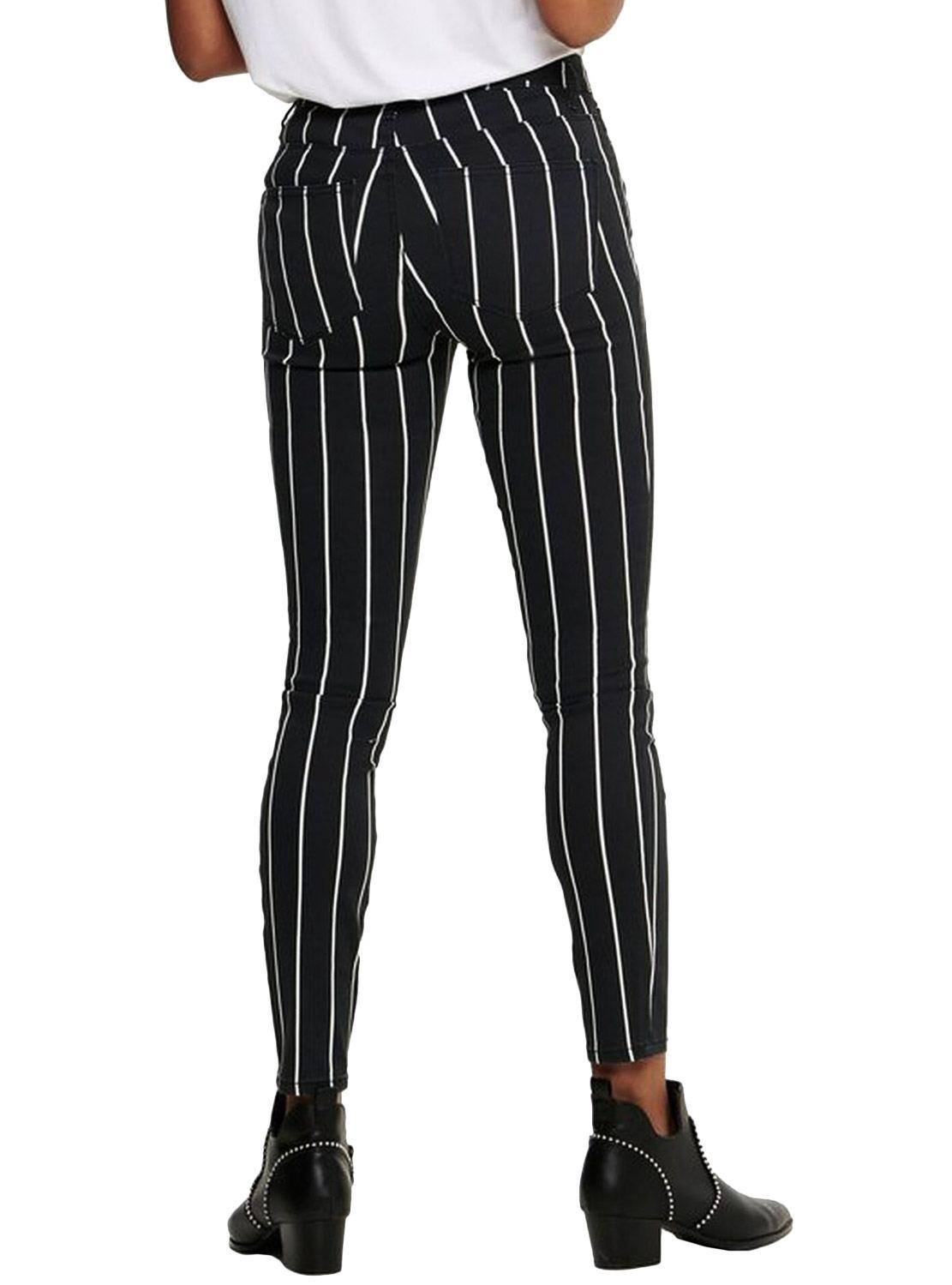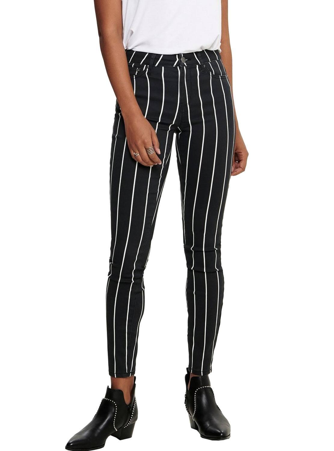 Calças Only. Cor preta. Estampados de listas. Cinta de tornozelo Corte. Fecho na frente. Formato ajustado cintura alta 5 bolsos A modelo está usando tamanho S.
