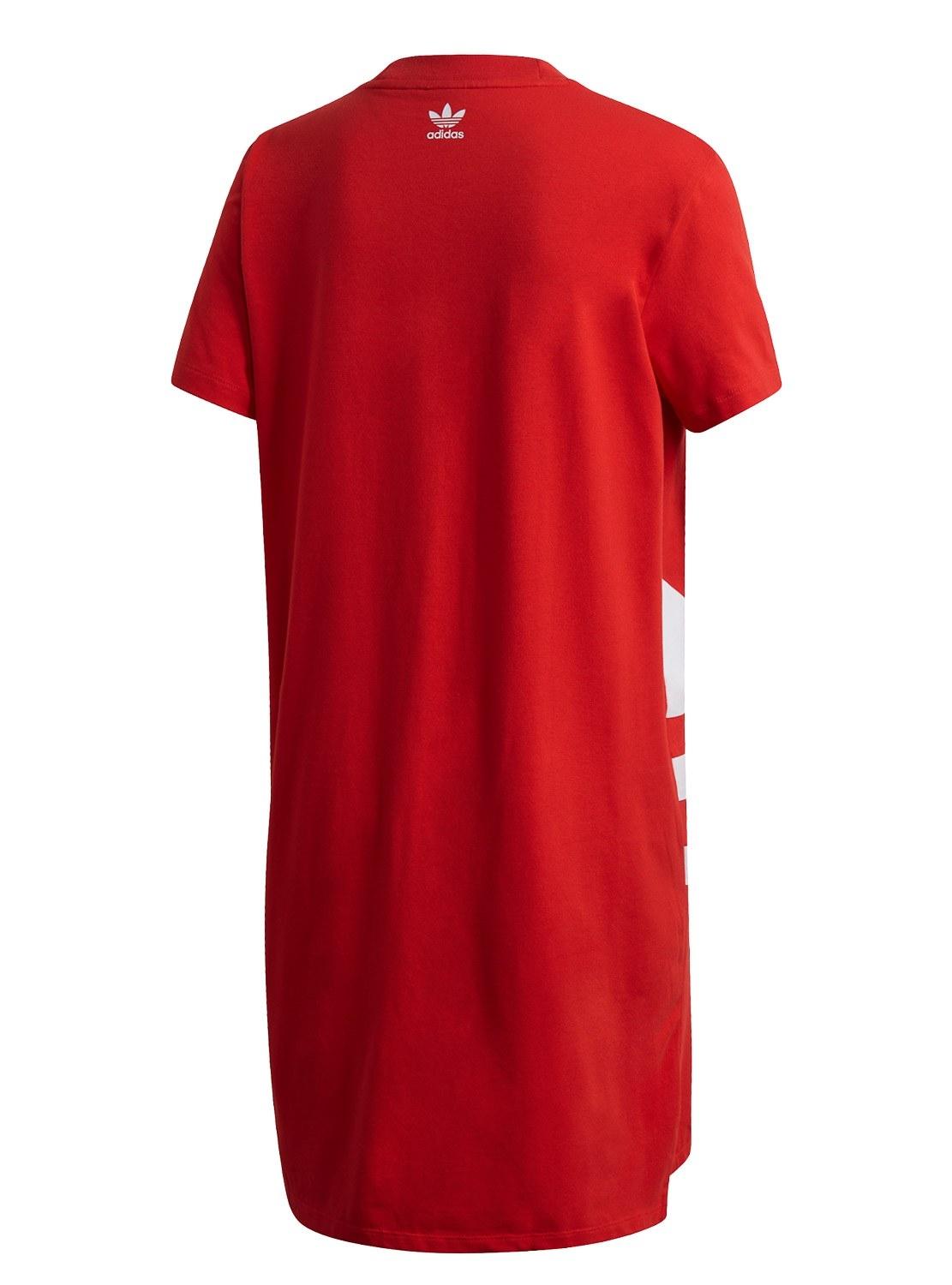 Vestido Adidas. Corte folgado. Estilo de camiseta Cor vermelha Decote redondo. Manga curta. Bainha traseira mais longa. Costuras laterais abertas. Grande logotipo na frente. O modelo está usando tamanho 36.