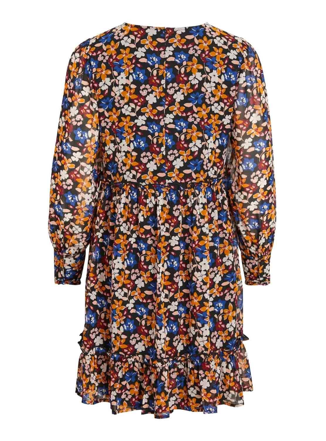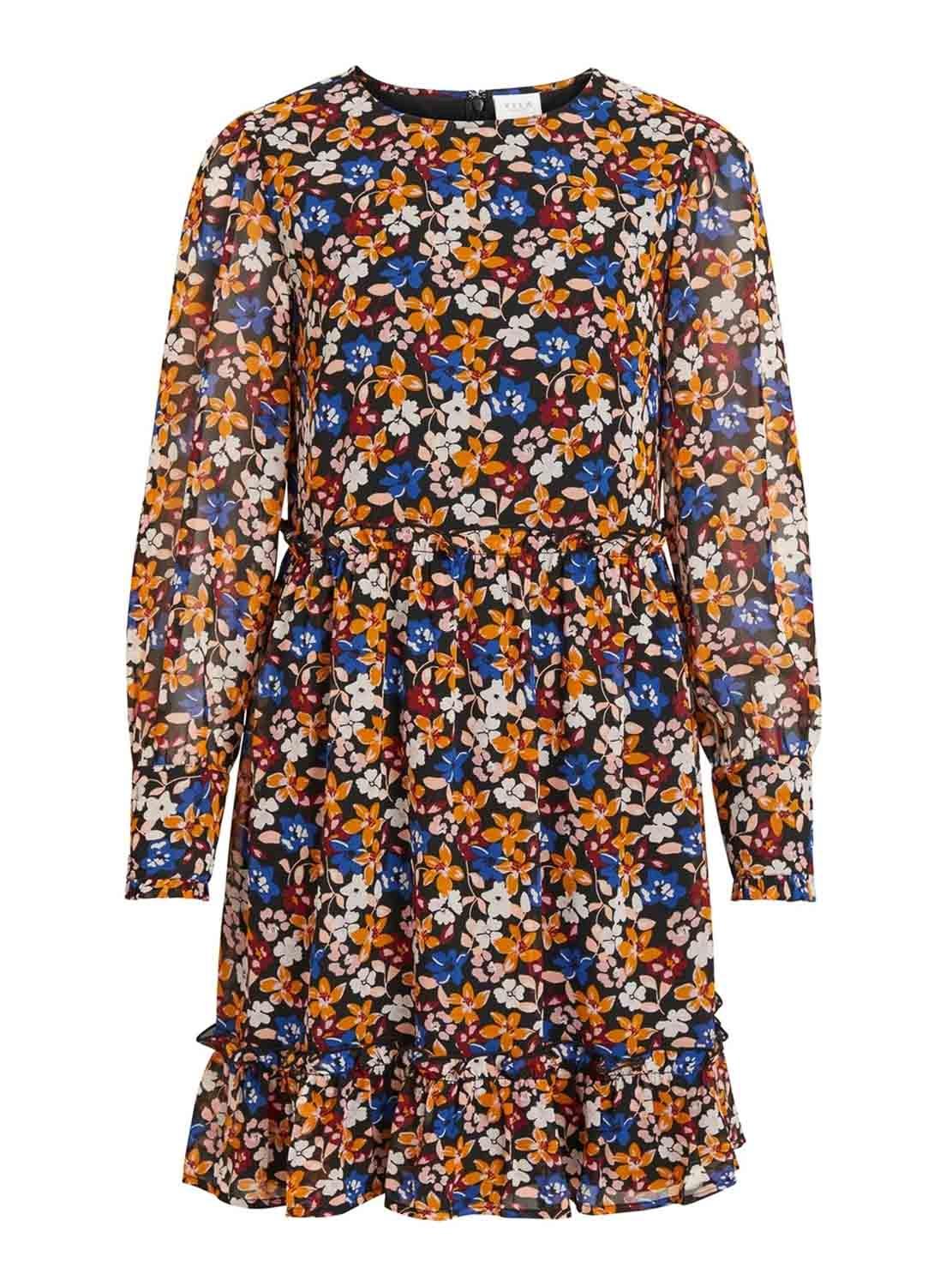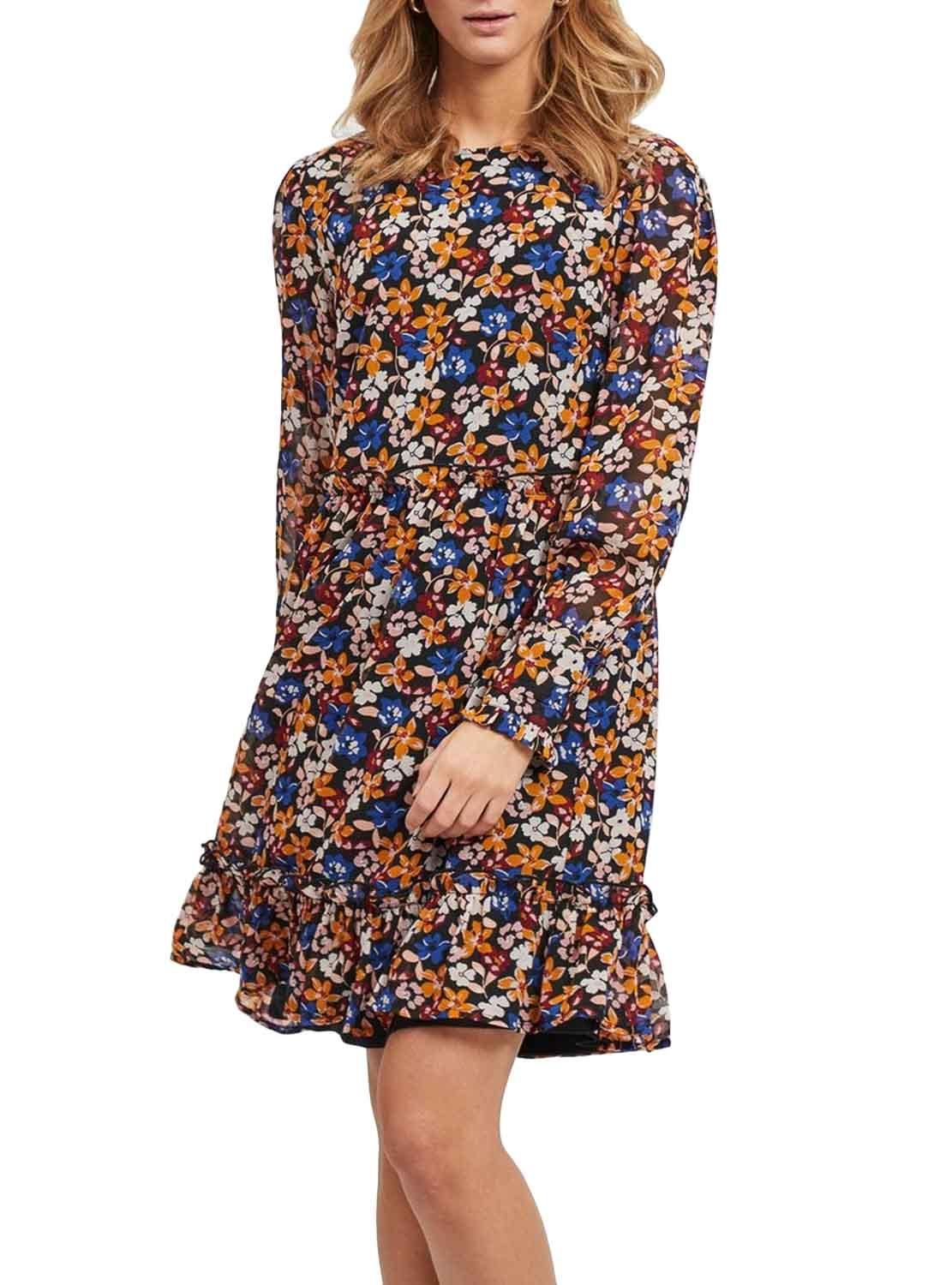 Vestido da Vila. Modelo Taba. Estampado de flores. Manga comprida. Decote redondo. O modelo está usando tamanho 38.