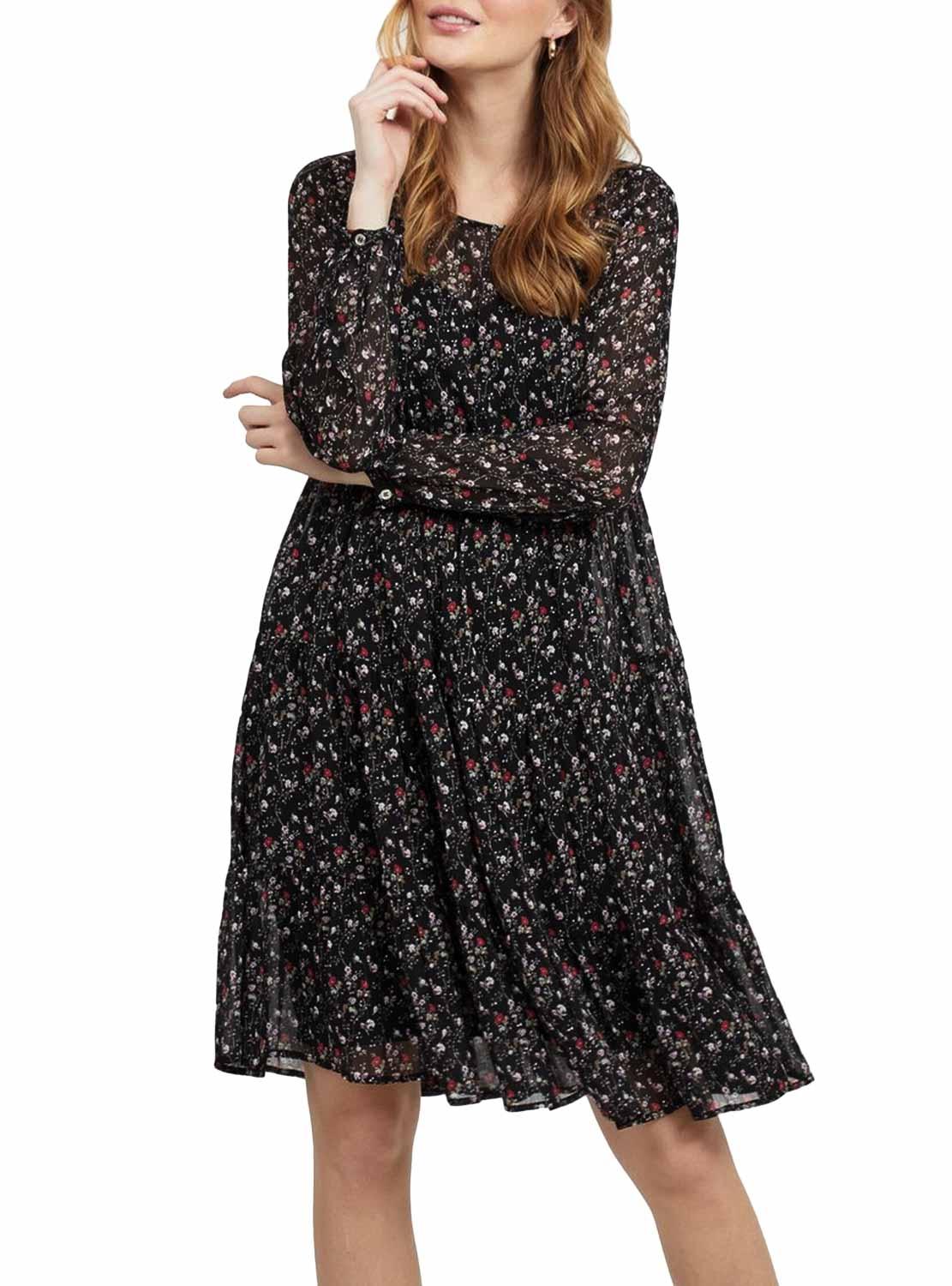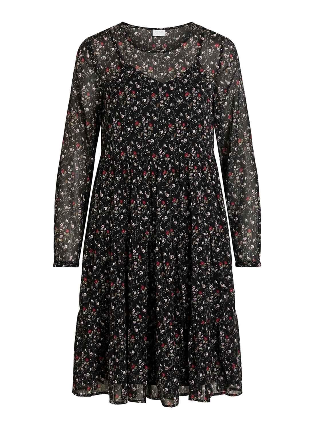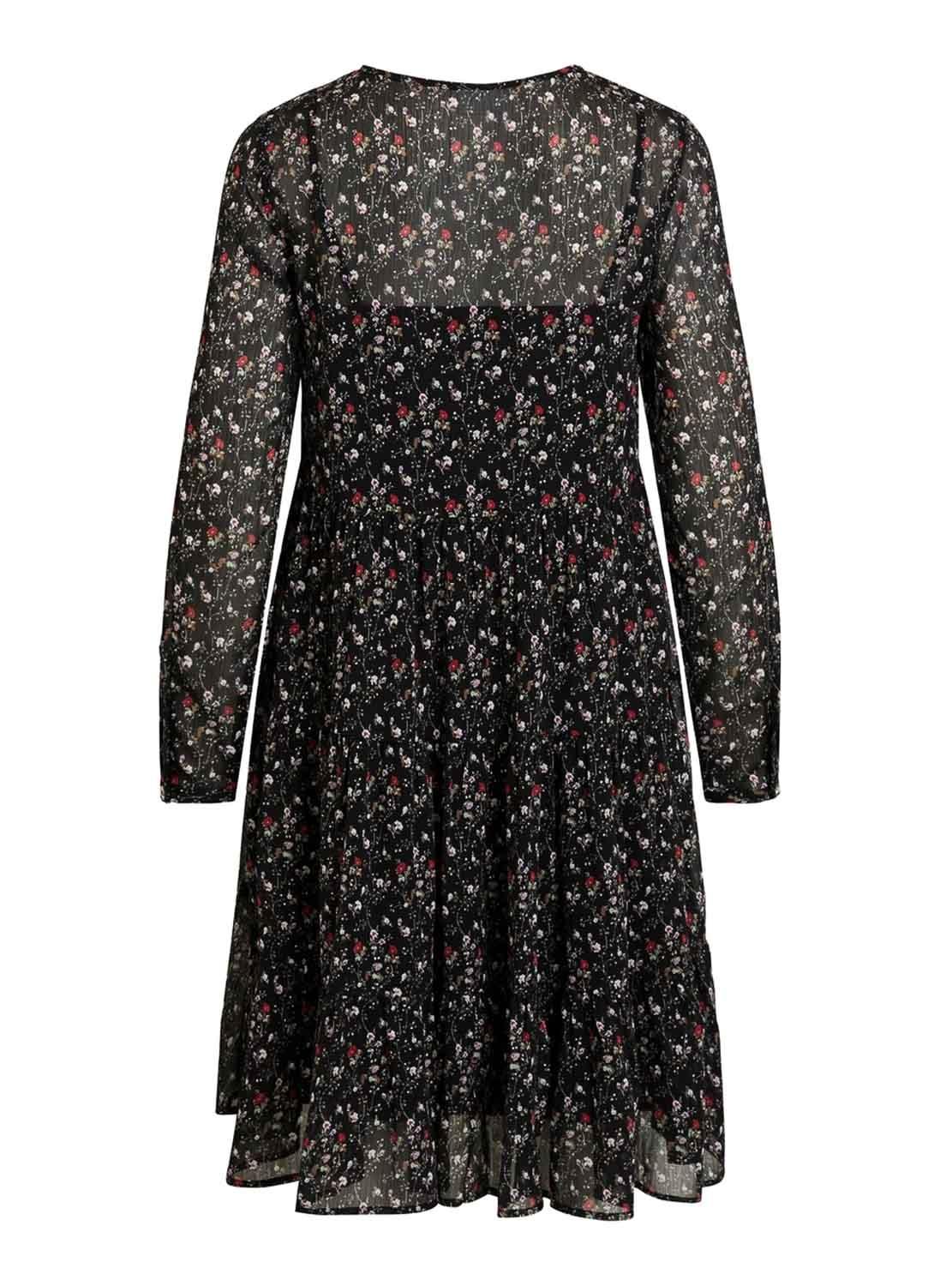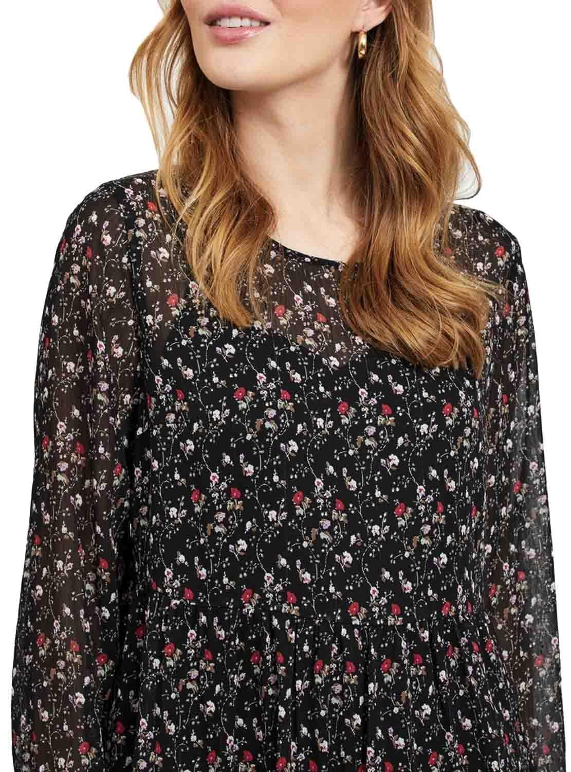 Vestido da Vila. Modelo Flis. Cor preta. Manga comprida. Decote redondo. Estampado de flores. Com transparências. O modelo está usando tamanho 38.