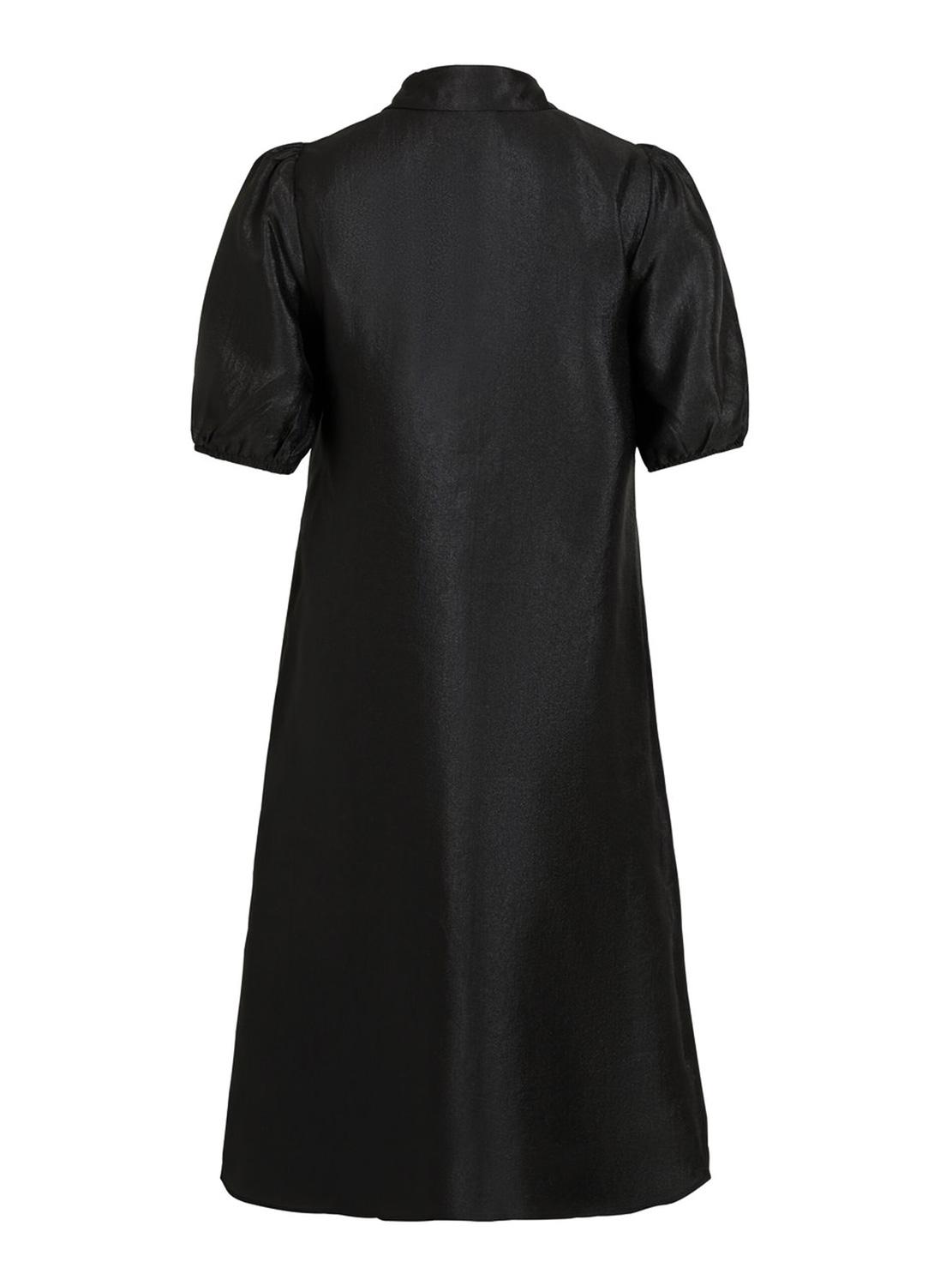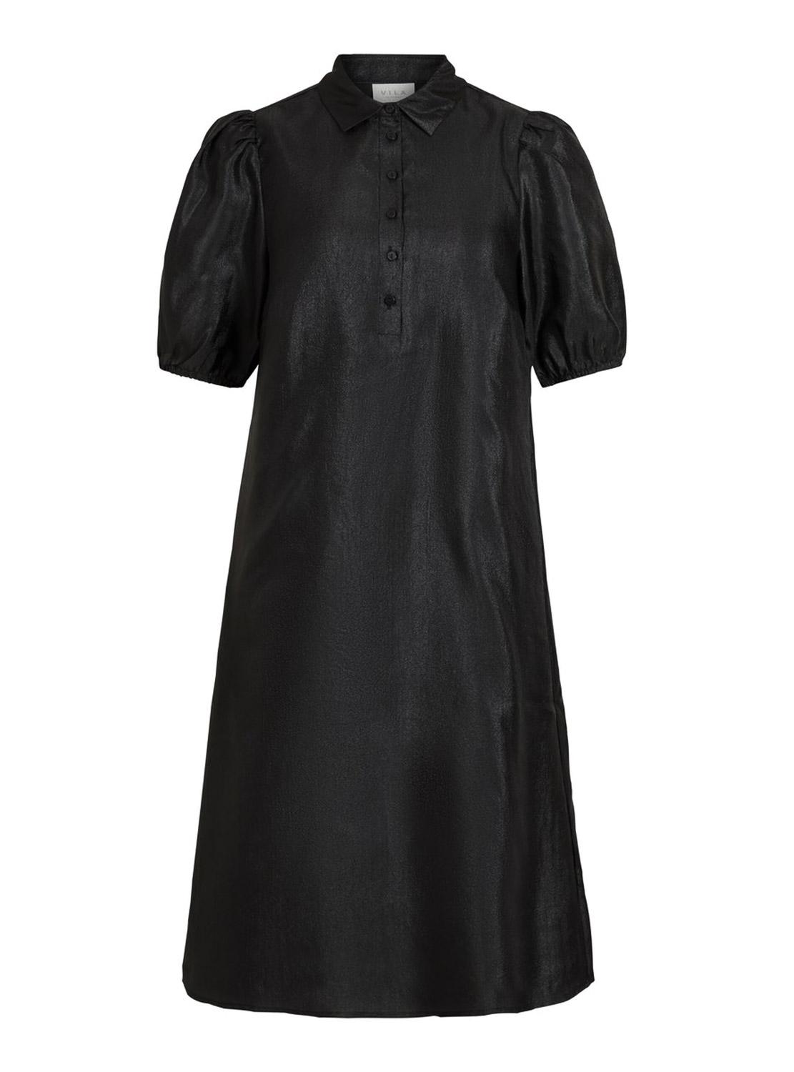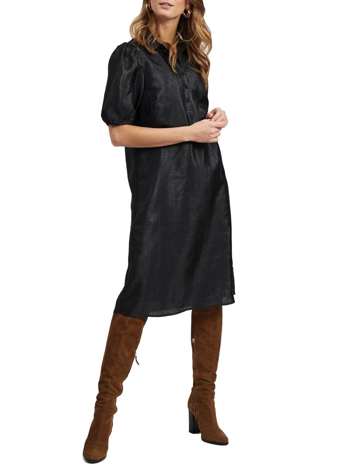 Vestido Vila. Modelo Richter. Cor preta. Manga curta. Botões na frente. 2 camadas. O modelo está usando tamanho 38.