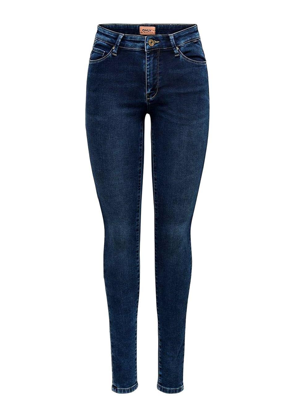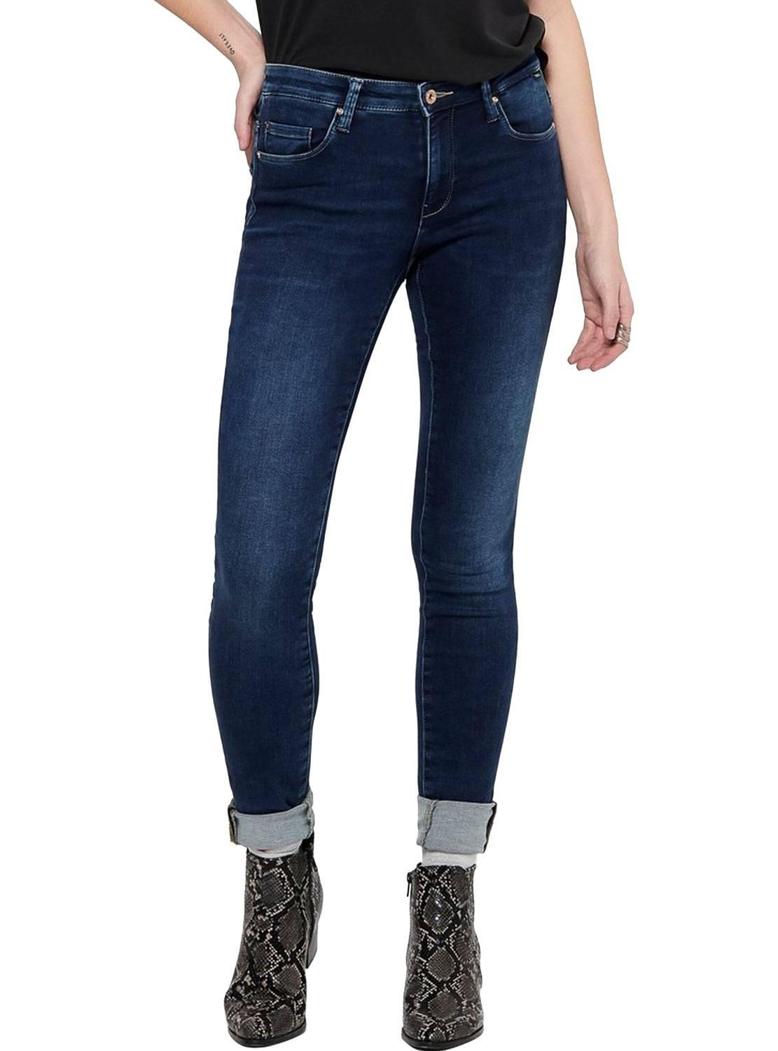 Jeans Only. Modelo Carmen. Jeans escuro. Cintura alta. Efeito Desgastado Cinco bolsos Ajuste Skinny. Tecido elástico.