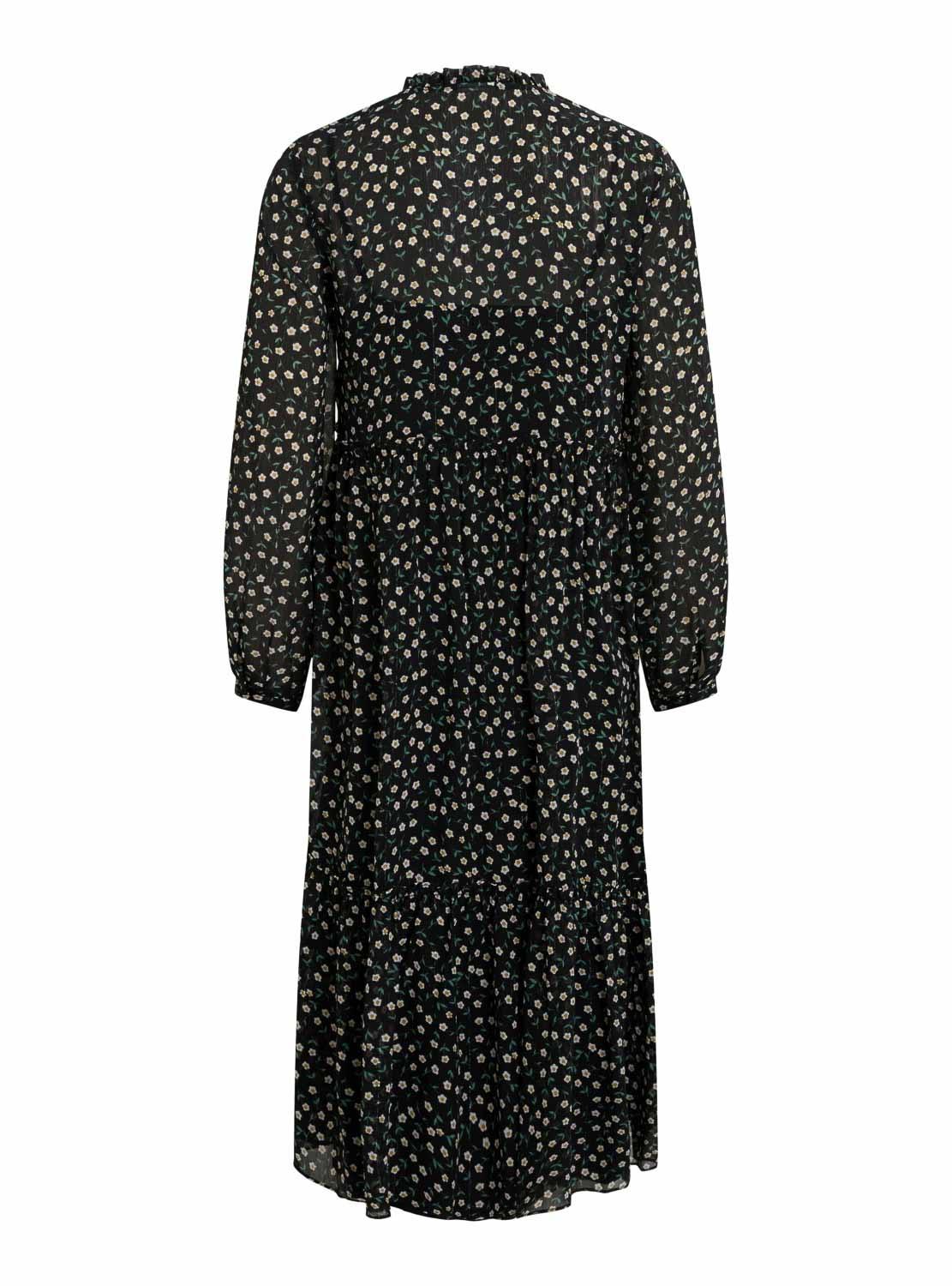 Vestido da Vila. Modelo Minu. Cor preta. Manga comprida. Decote redondo. Botão frontal. Estampado de flores. Com transparências. Forro de malha preto.