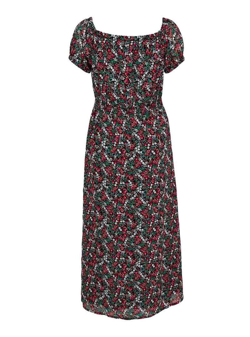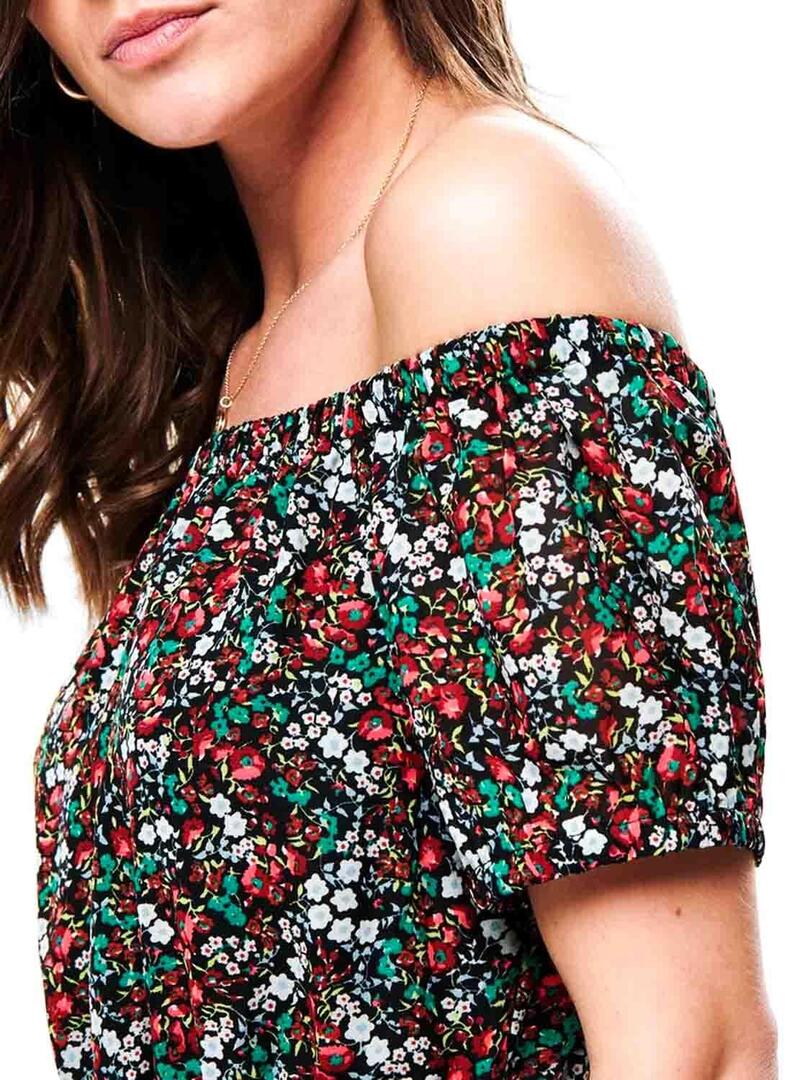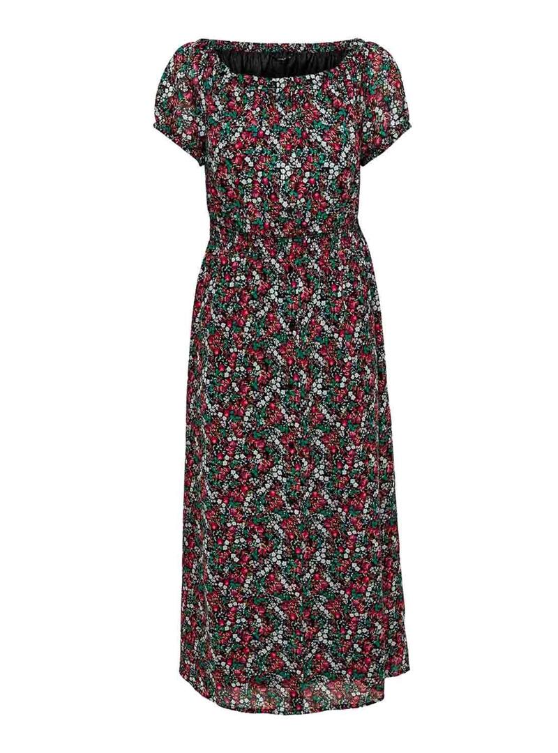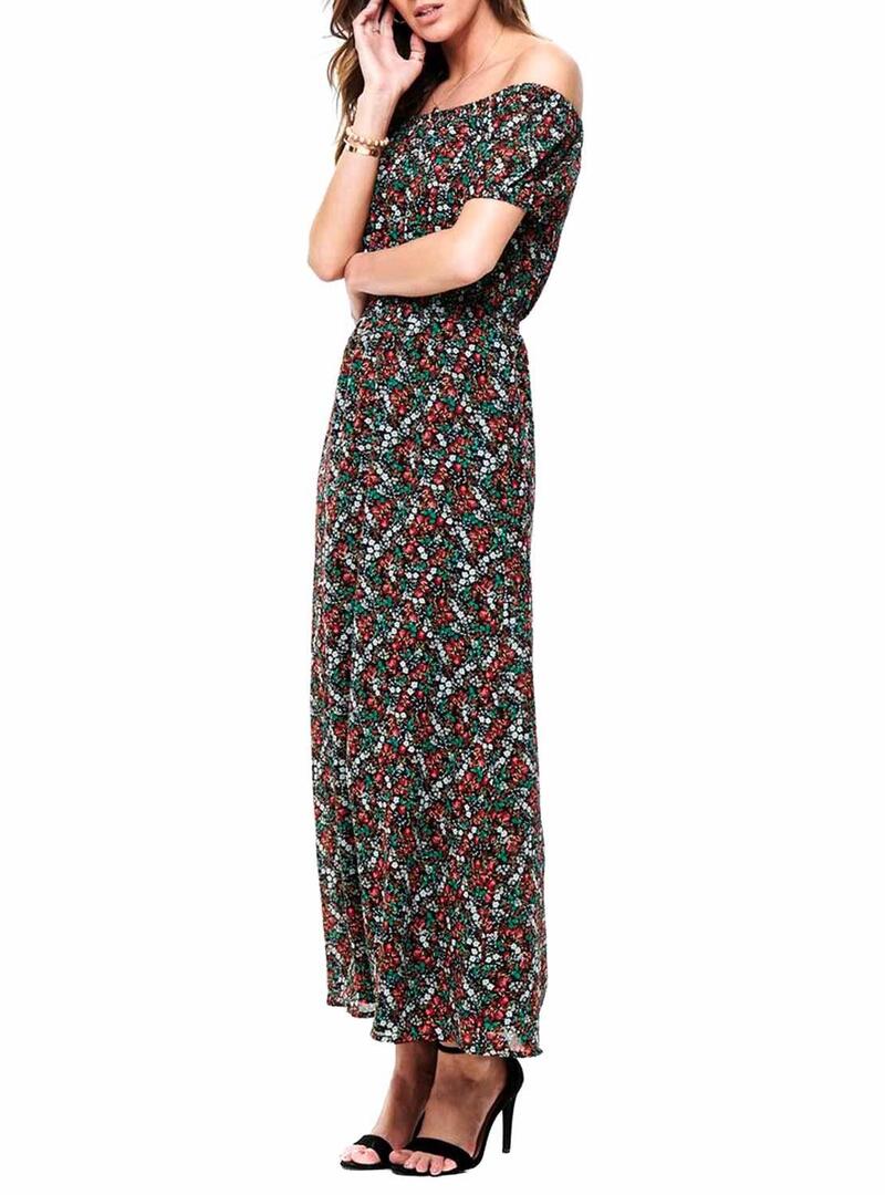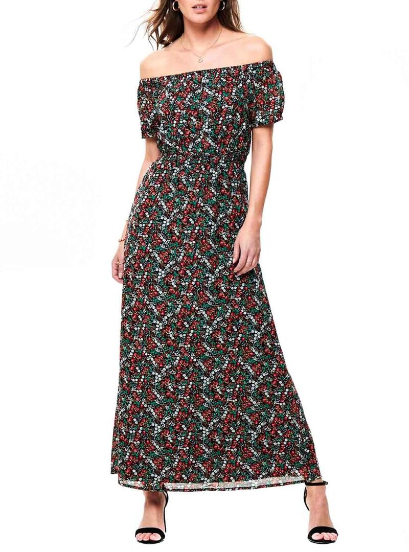 Only vestido. Modelo Misha. Cor preta Teste padrão floral. Decote Bardot. Manga curta. Cintura elástica Long maxi