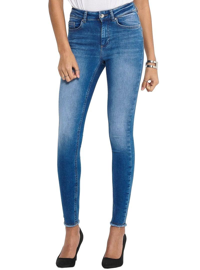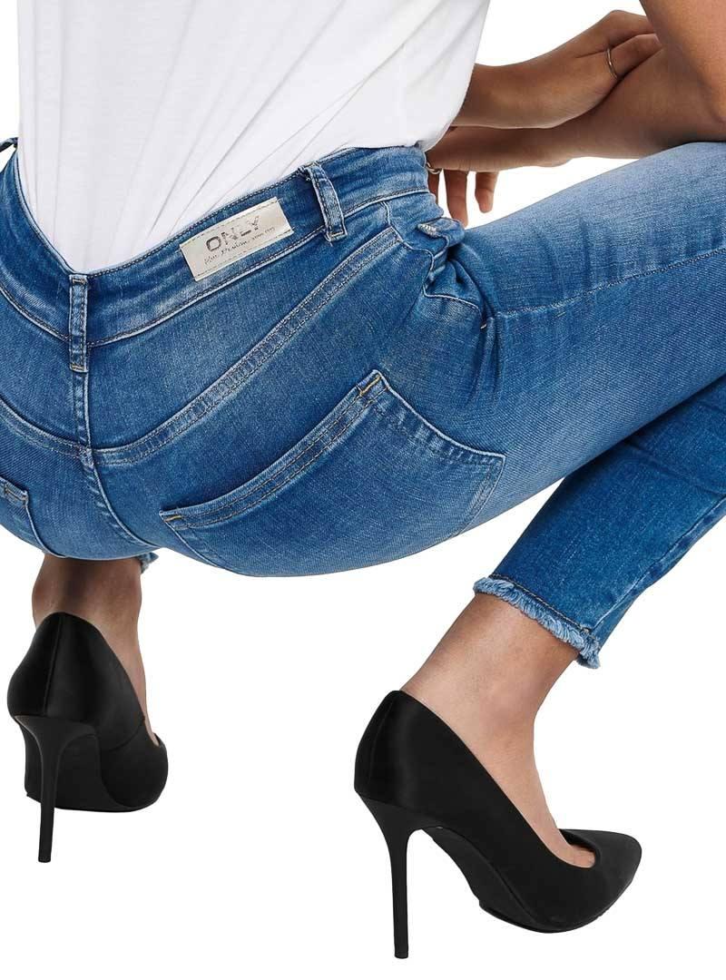 Jeans Only. Modelo Blush. Jeans médio. Cintura alta. Fecho de botão e zíper. Cinco bolsos. Baixo inacabado.